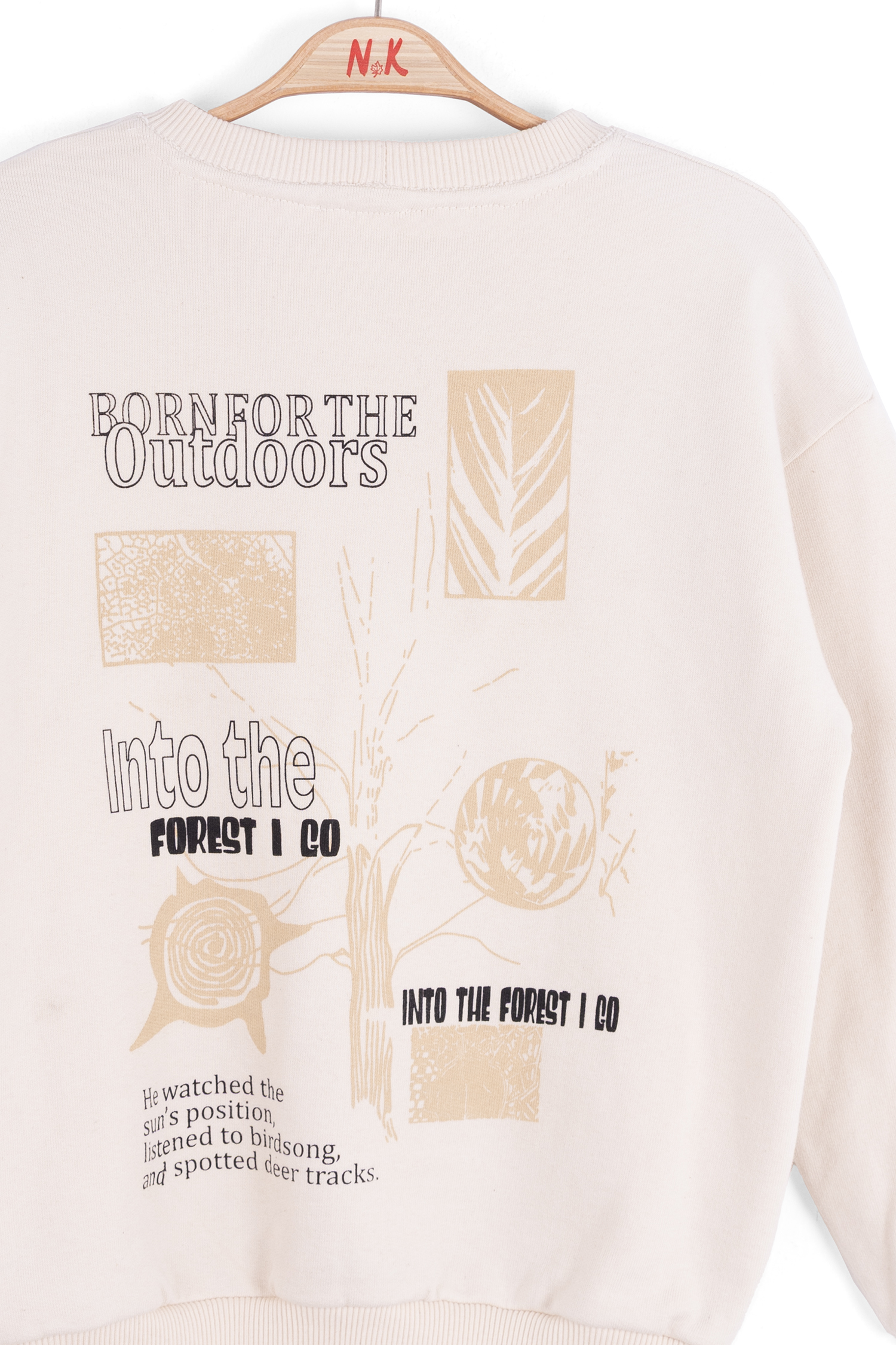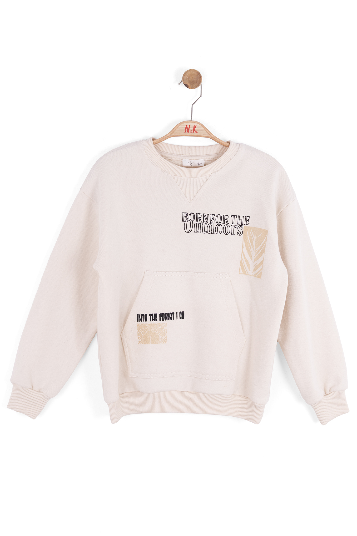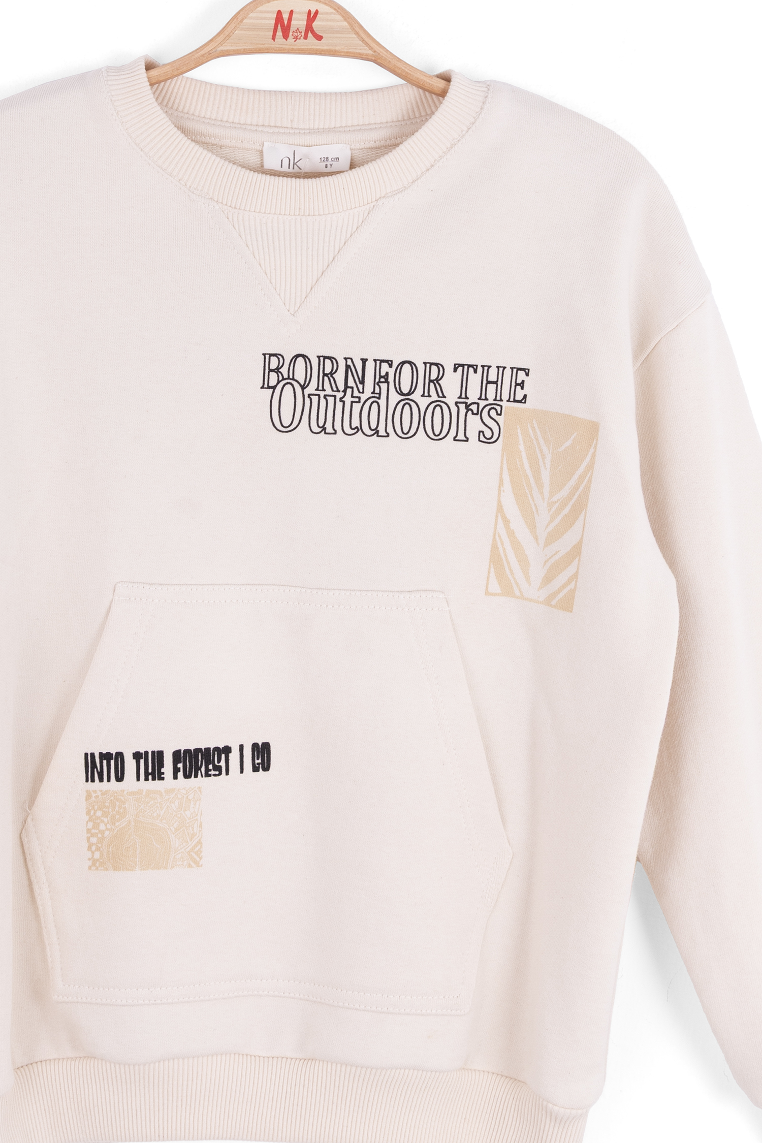 سويت شيرت بلون كريمي للأطفال من الذكور يوفر راحة وأناقة للاستخدام اليومي. التصميم بدون قبعة وبدون سحاب، مع ياقة دائرية وأكمام طويلة تسمح بحرية الحركة. جيب كنغر أمامي يضيف عملية وأسلوبًا في نفس الوقت. الطباعة المستوحاة من الطبيعة بعبارات "Born for the Outdoors" و "Into the Forest I Go" تضفي مظهرًا عصريًا مع تفاصيل مميزة تضيف لمسة حديثة.
