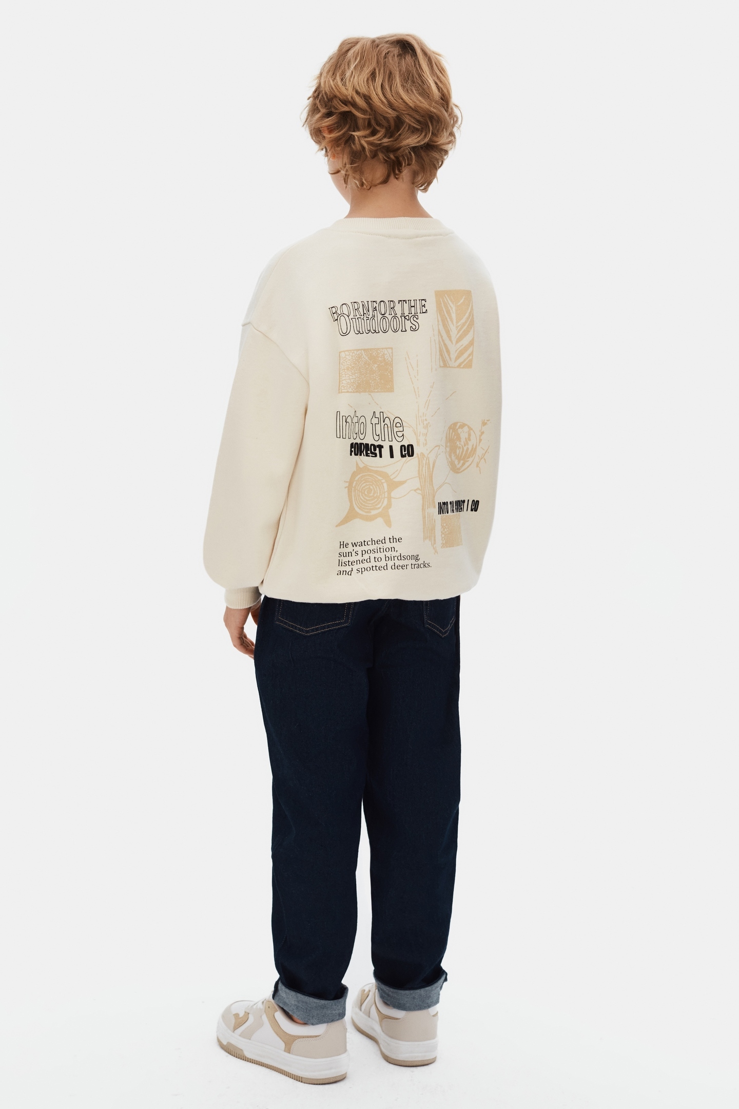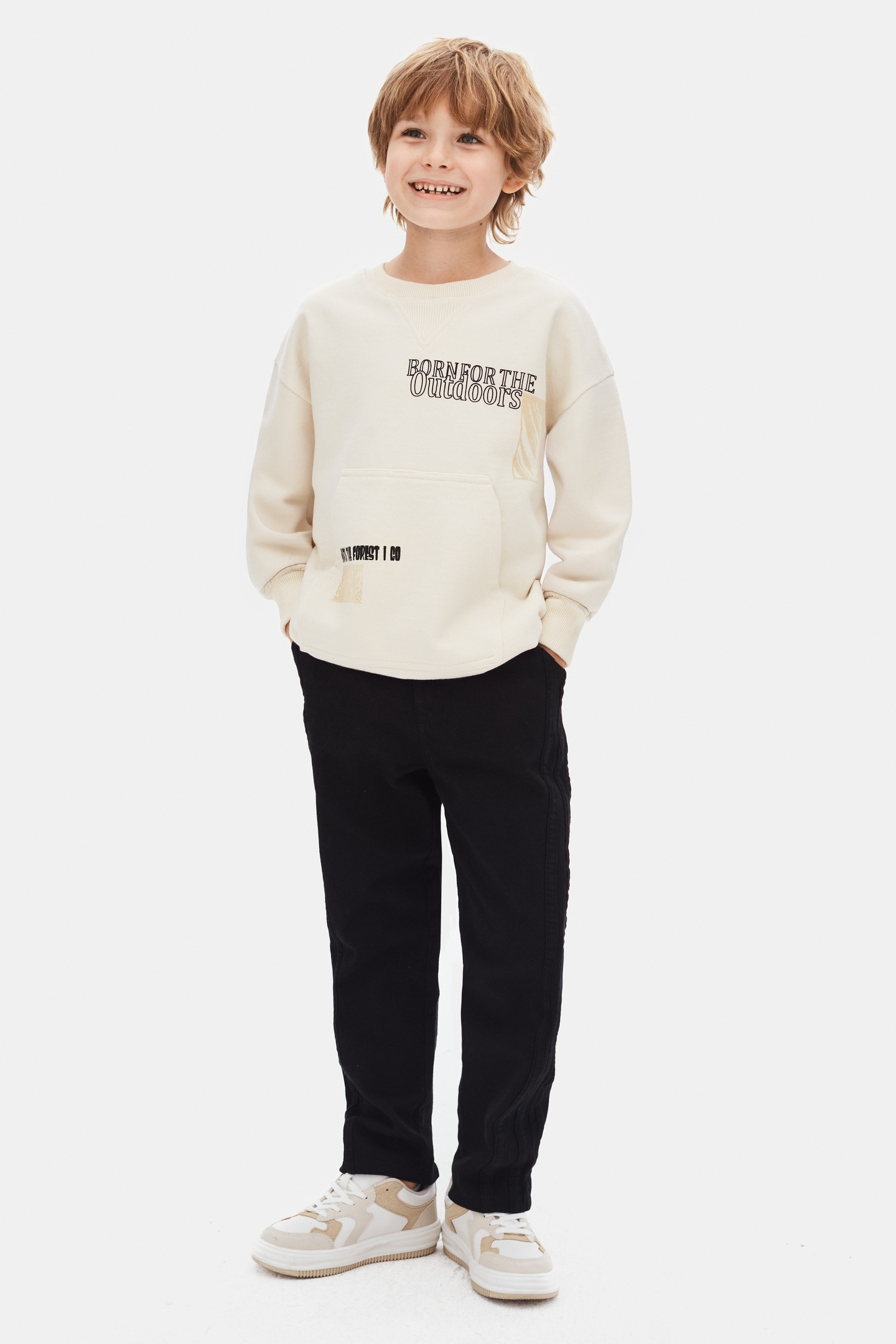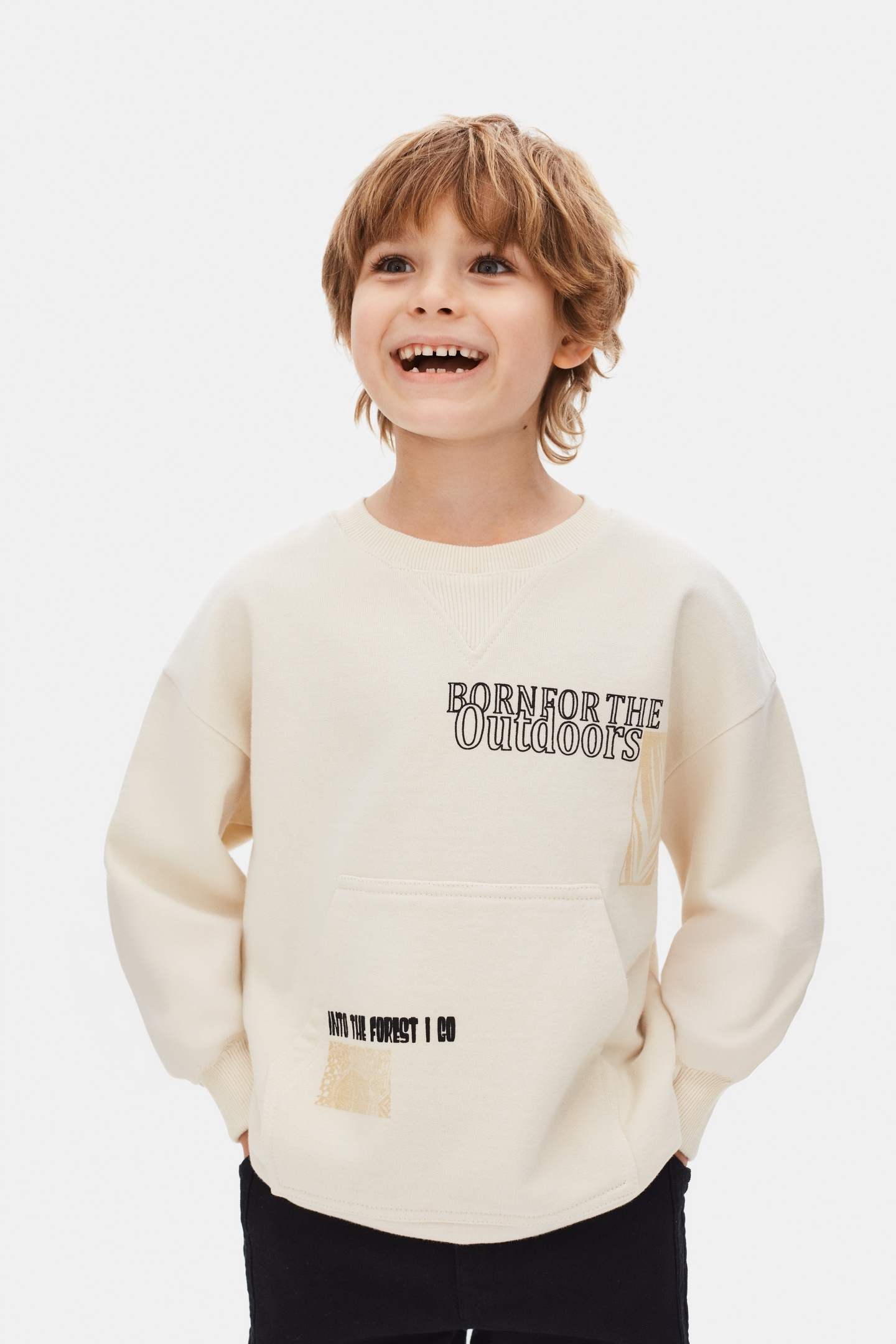 سويت شيرت بلون كريمي للأطفال من الذكور يوفر راحة وأناقة للاستخدام اليومي. التصميم بدون قبعة وبدون سحاب، مع ياقة دائرية وأكمام طويلة تسمح بحرية الحركة. جيب كنغر أمامي يضيف عملية وأسلوبًا في نفس الوقت. الطباعة المستوحاة من الطبيعة بعبارات "Born for the Outdoors" و "Into the Forest I Go" تضفي مظهرًا عصريًا مع تفاصيل مميزة تضيف لمسة حديثة.