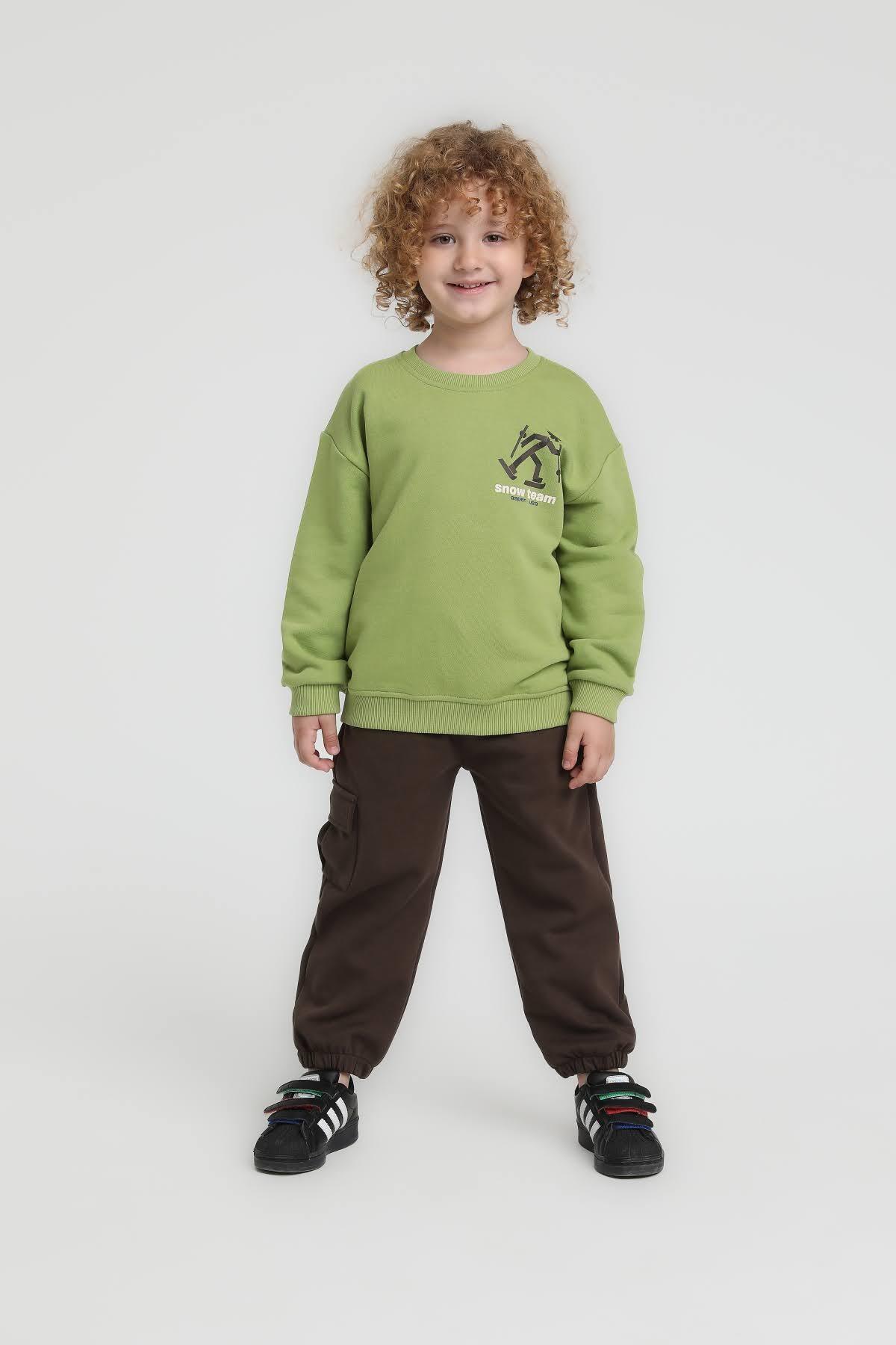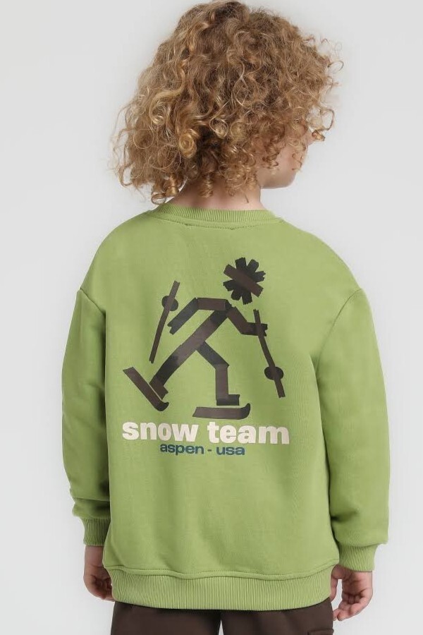 Bu erkek çocuk sweatshirt'ü, yumuşak ve konforlu kumaşıyla kış ayları için ideal bir tercih. Fıstık yeşili tonunda olan ürün, kapüşonsuz ve fermuarsız sade tasarımıyla günlük kullanıma uygundur. Uzun kollu ve bisiklet yakalı modeli sayesinde rahatlık sağlar. Ön ve arka yüzünde "snow team" yazısı ve kayak yapan stilize bir figür baskısı bulunur. Cepli veya kordonlu olmayan bu sweatshirt, rahat kesimiyle çocukların hareket özgürlüğünü destekler.