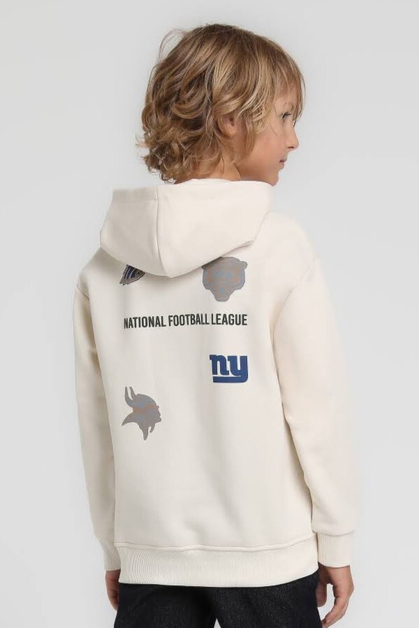 Bu erkek çocuk sweatshirtü, rahat ve sıcak tutan kapüşonlu tasarımıyla kış ayları için idealdir. Ekru rengindeki sweatshirt, ön ve arka yüzeyde yer alan renkli Amerikan futbolu temalı baskılarla dikkat çeker. Fermuarsız, sade ve kullanışlı yapısıyla çocukların hareket özgürlüğünü kısıtlamaz. Uzun kollu ve bisiklet yakalı olan model, ribana manşetleri ile ekstra konfor sunar. Günlük ve sportif tarzda kombinlenebilir.