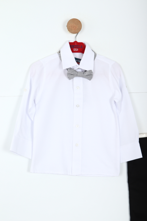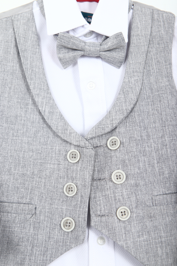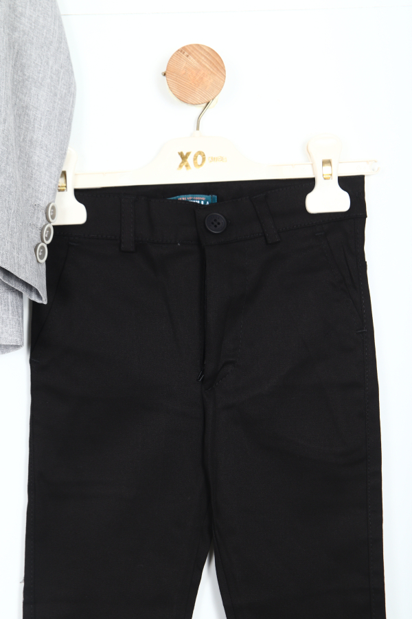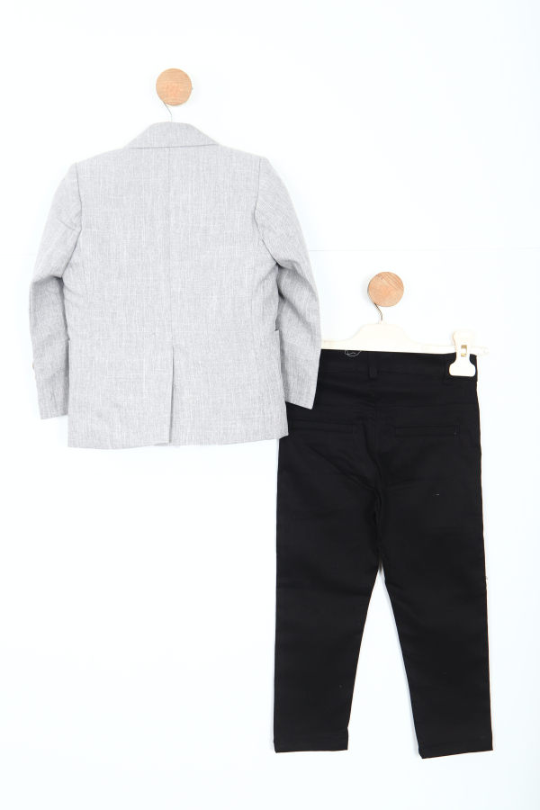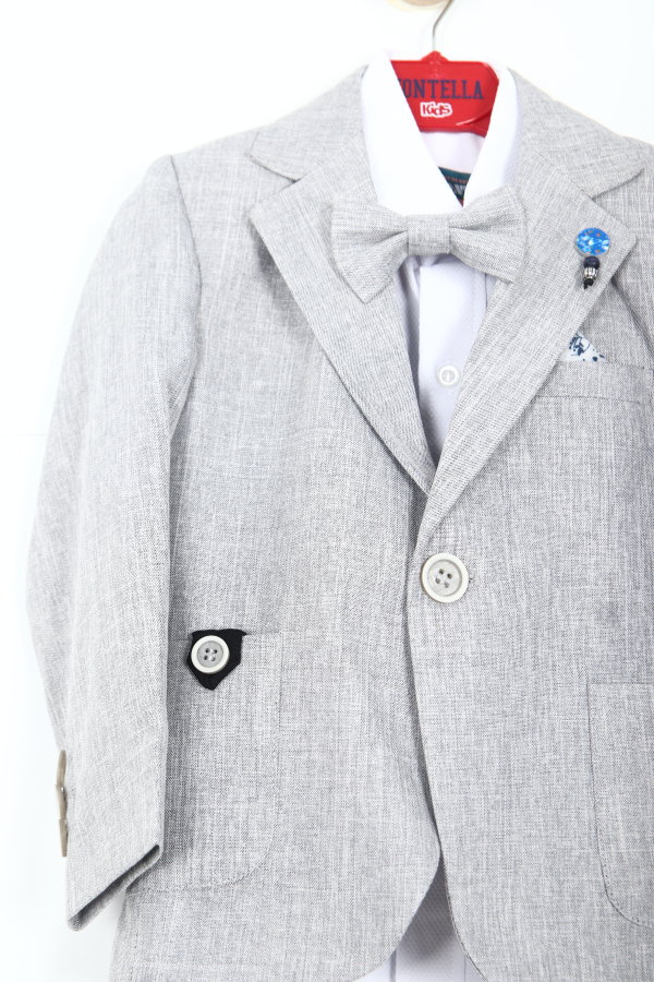 تقدم هذه الطقم الرسمي للأطفال من الأولاد خيارًا أنيقًا وراقيًا للمناسبات الخاصة والاحتفالات. الجاكيت بلون رمادي فاتح بتصميم كلاسيكي بزر واحد وأكمام طويلة، مزود بتفاصيل دقيقة تضيف لمسة جمالية. يترافق مع ربطة عنق صغيرة ودبوس زخرفي على الياقة. تكمل البناطيل السوداء ذات القصّة المستقيمة مع حزام الخصر المظهر الكلاسيكي العصري. التصميم يجمع بين البساطة والراحة والأناقة.