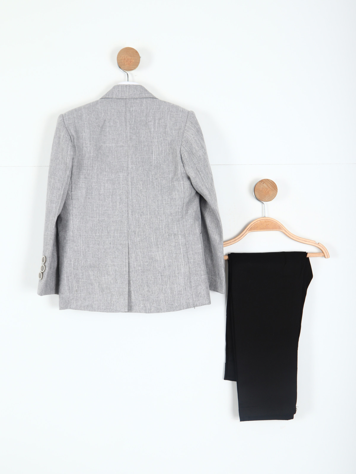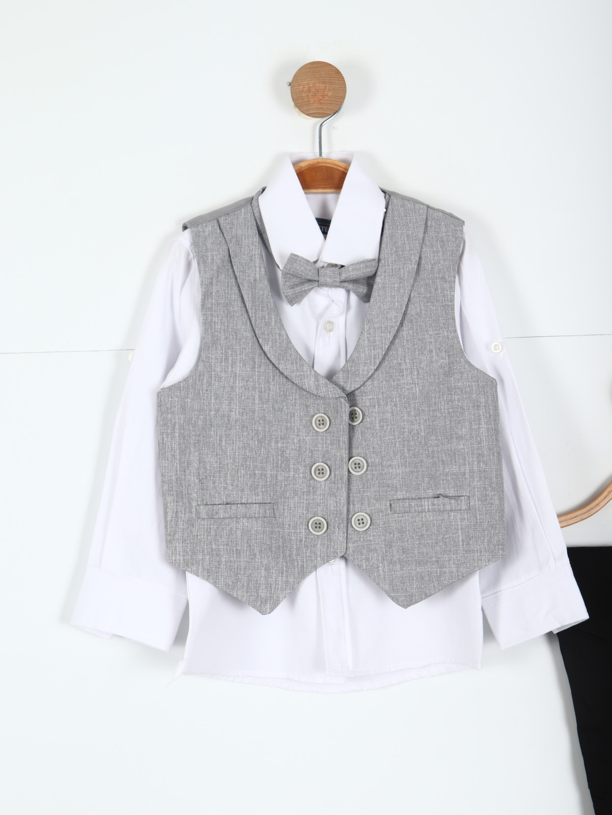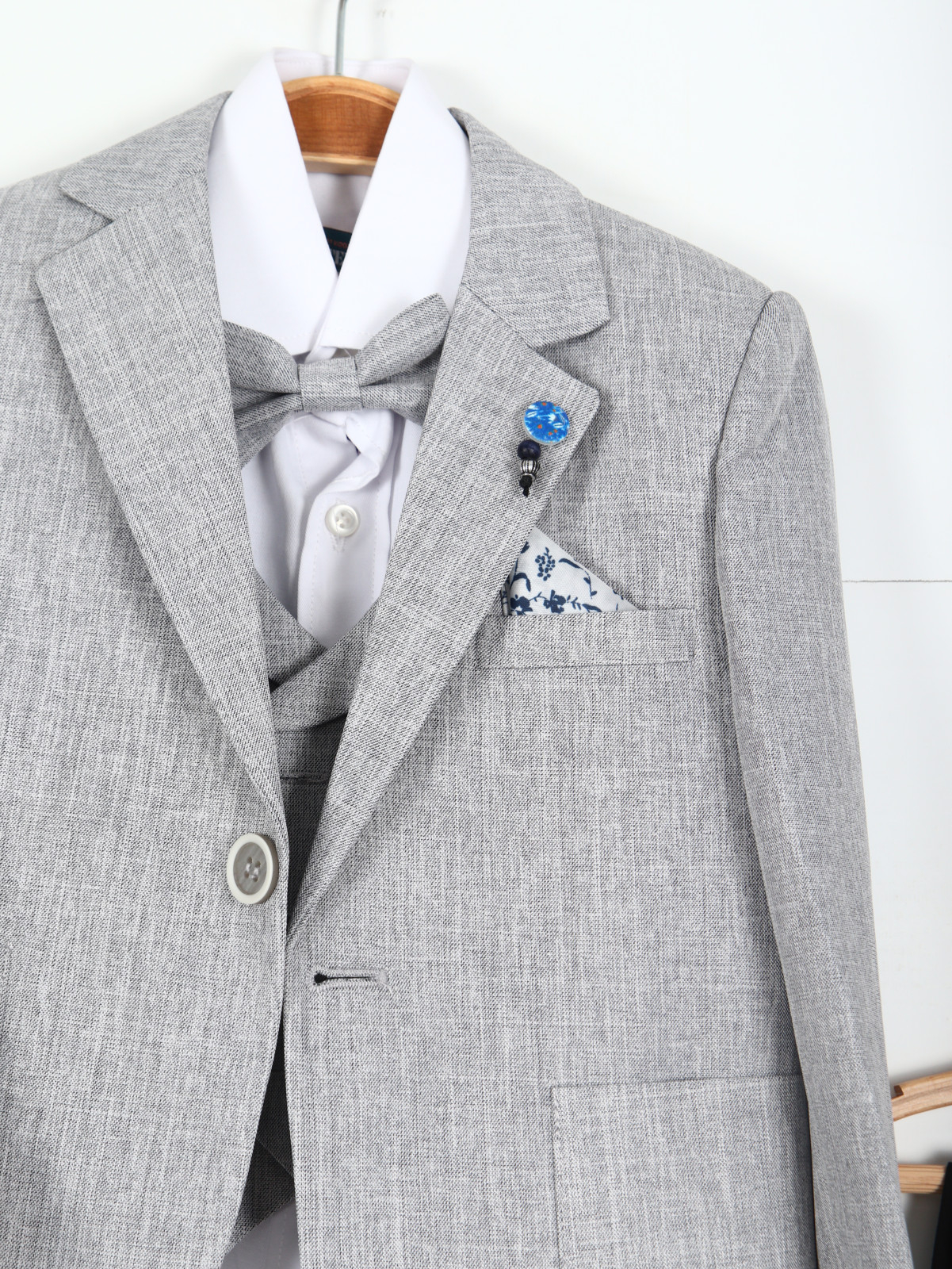 Bu erkek çocuk takım elbise seti, özel günler ve davetler için şık ve zarif bir tercih sunar. Açık gri tonlarında, klasik kesimli ceket, tek düğmeli ve uzun kollu olup, küçük detaylarla zenginleştirilmiştir. Ceket üzerinde papyon ve şık bir yaka iğnesi aksesuarı dikkat çeker. Alt kısmında ise siyah, düz kesim, kemerli pantolon yer alır. Takım, sade ama modern çizgileriyle hem rahat hem de şık bir görünüm sağlar.