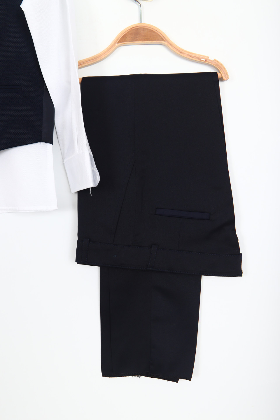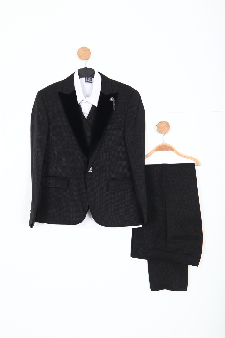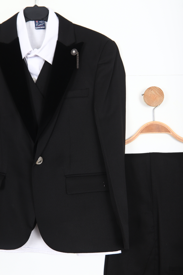 Bu erkek çocuk takım elbise, özel günler ve davetler için şık ve zarif bir tercih sunar. Takım, açık mavi renkte olup, ceketin yaka kısmında koyu lacivert kadife detaylar bulunmaktadır. Ceket tek düğmeli ve uzun kolludur, ayrıca yanlarında kapaklı cepler yer almaktadır. Üç düğmeli yelek, takımın tamamlayıcısı olarak eşlik eder ve arka kısmı siyah astarlıdır. Pantolon ise klasik kesim ve düz paçalıdır. Takım, modern ve klasik tarzı bir arada sunarak çocukların rahat hareket etmesini sağlar.