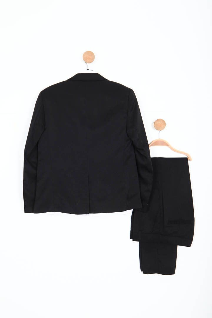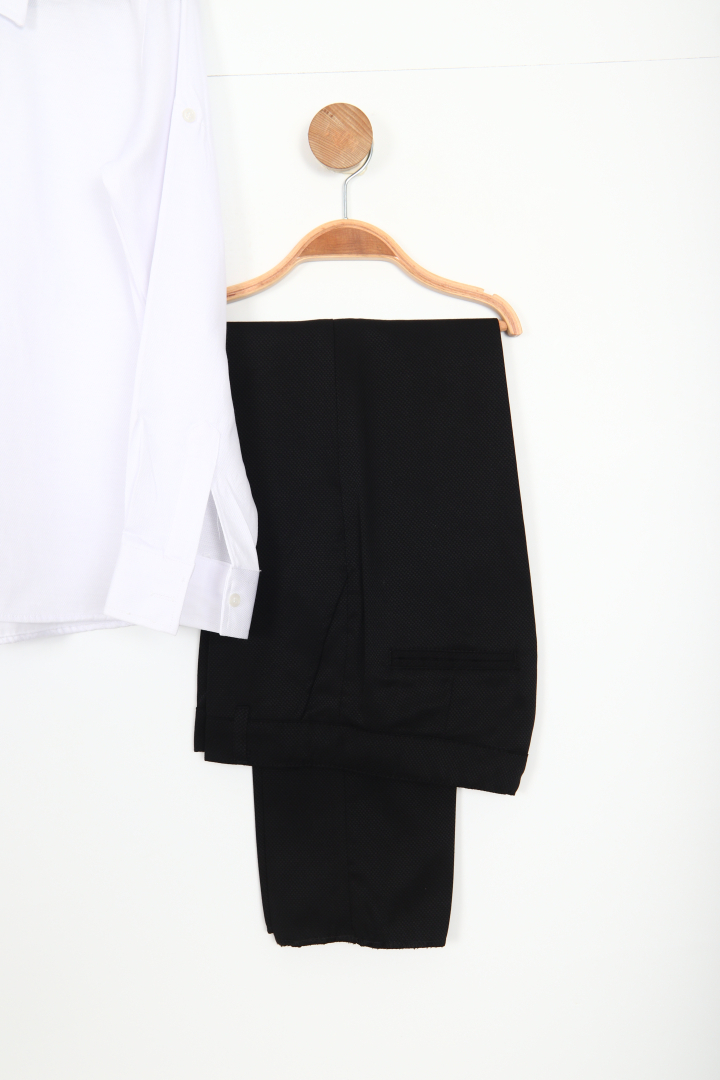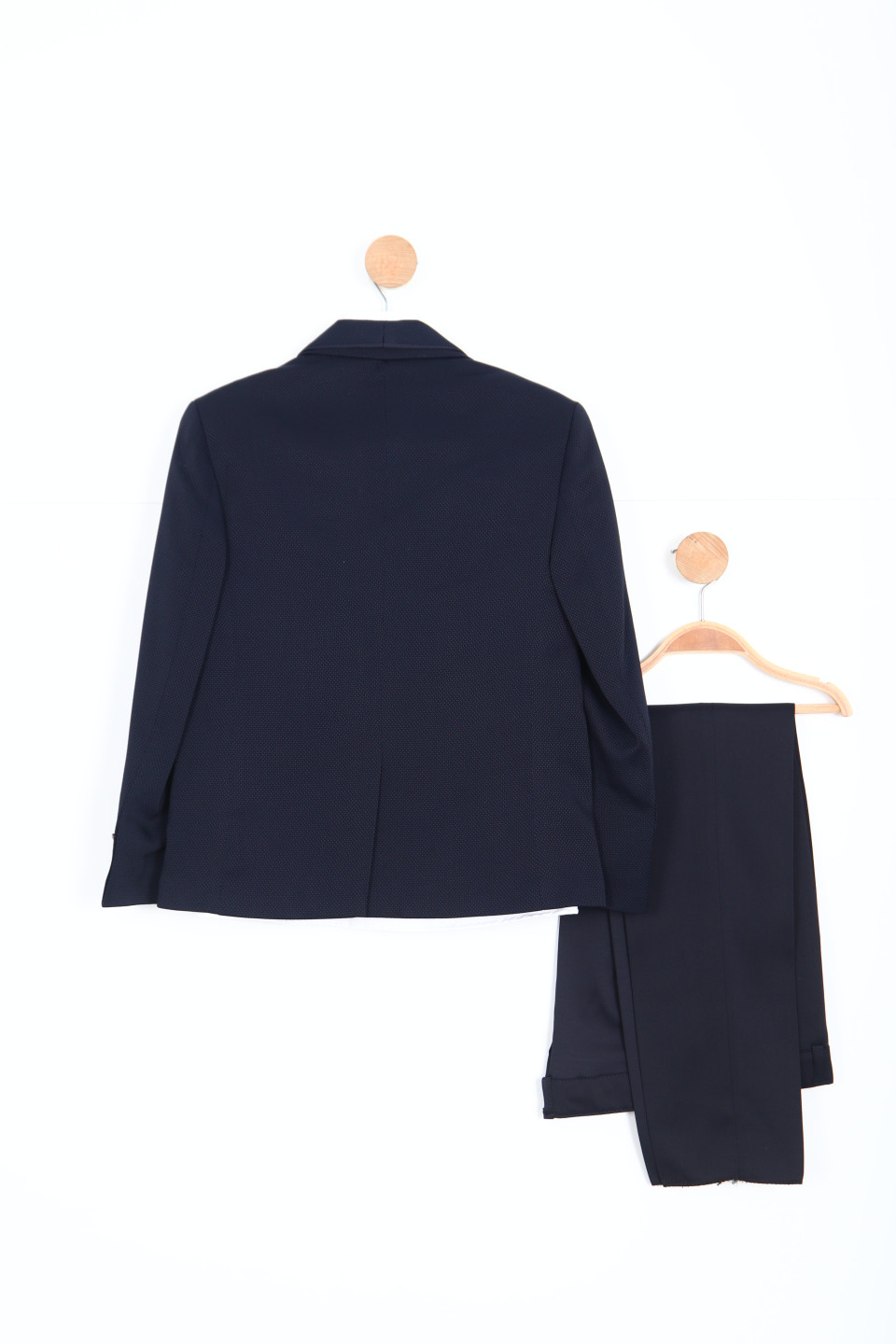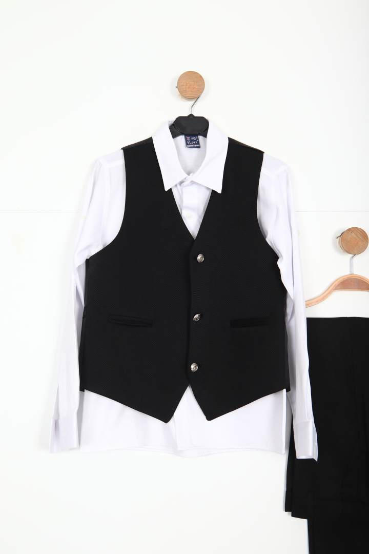 Bu erkek çocuk takım elbise, özel günler ve davetler için şık ve zarif bir tercih sunar. Takım, açık mavi renkte olup, ceketin yaka kısmında koyu lacivert kadife detaylar bulunmaktadır. Ceket tek düğmeli ve uzun kolludur, ayrıca yanlarında kapaklı cepler yer almaktadır. Üç düğmeli yelek, takımın tamamlayıcısı olarak eşlik eder ve arka kısmı siyah astarlıdır. Pantolon ise klasik kesim ve düz paçalıdır. Takım, modern ve klasik tarzı bir arada sunarak çocukların rahat hareket etmesini sağlar.