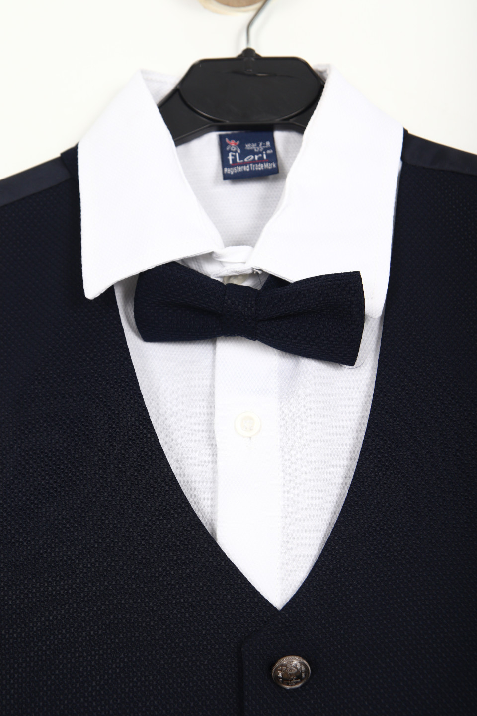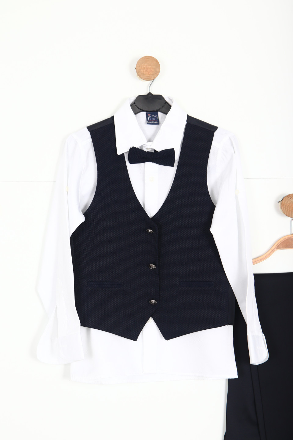 Bu erkek çocuk takım elbise, özel günler ve resmi davetler için şık ve zarif bir tercihtir. Lacivert renkte olan takım, klasik kesimiyle çocuklara hem rahat hem de şık bir görünüm sunar. Ceket, tek düğmeli ve şal yaka tasarıma sahip olup, kol manşetlerinde üçer düğme detayı bulunur. Pantolon ise düz kesim ve paçaları hafif katlanmış şekilde tasarlanmıştır. Beyaz gömlek ise uzun kollu ve klasik yaka modelindedir, takımın tamamlayıcısı olarak sade ve temiz bir görünüm sağlar.