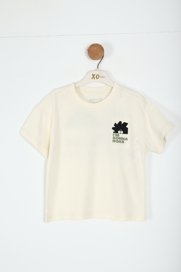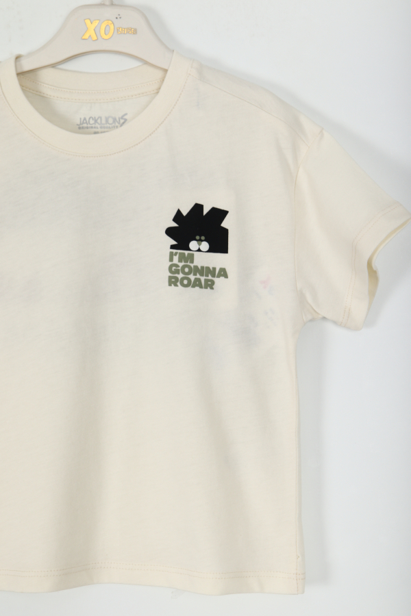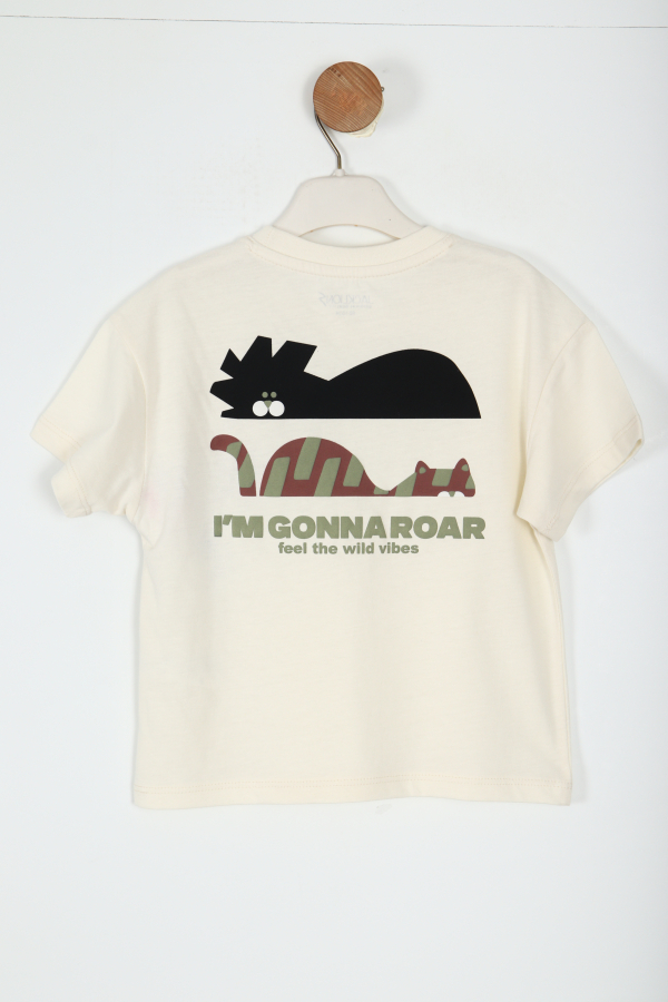 Bu çocuk tişörtü, ekru renkte sade ve şık bir tasarıma sahiptir. Kısa kollu ve bisiklet yaka yapısıyla rahat bir kullanım sunar. Ön kısmında ve sırtında bulunan sevimli ve eğlenceli "I'M GONNA ROAR" baskıları, tişörtü çocuklar için daha çekici hale getirir. Günlük kullanım için ideal, rahat kesimi sayesinde hareket özgürlüğü sağlar.