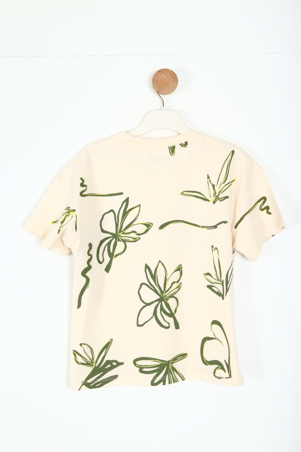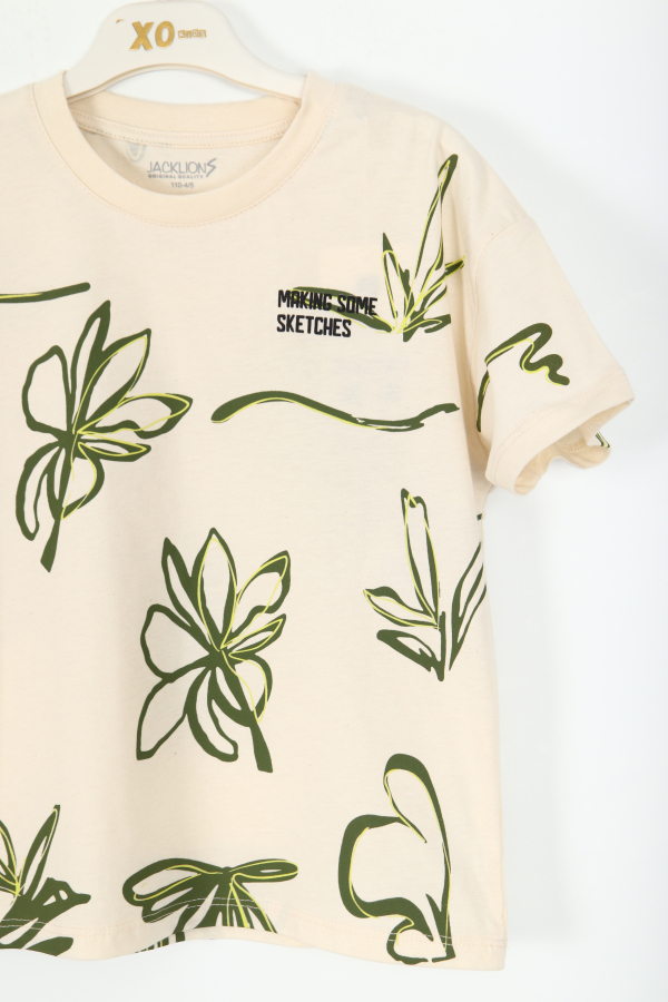 Erkek çocuklar için tasarlanmış bu tişört, rahatlığı ve şıklığı bir arada sunar. Kısa kollu ve sıfır yakalı model, yaz ayları için idealdir. Taş rengindeki kumaş üzerinde yeşil tonlarında soyut bitki desenleri bulunur, bu da tişörte doğal ve enerjik bir hava katar. Üzerinde küçük ama dikkat çekici "Making Some Sketches" yazısı yer almakta, tişörte özgünlük katmaktadır. Günlük kullanıma uygun, konforlu ve şık bir seçimdir.