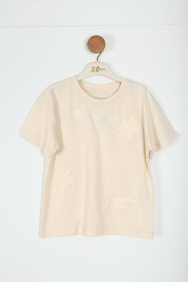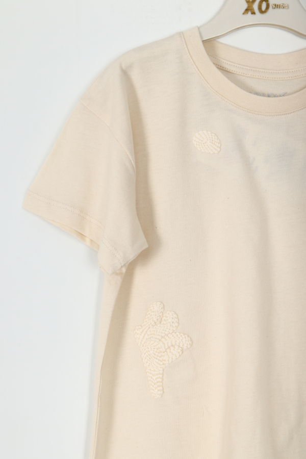 Bu erkek çocuk tişörtü, sade ve şık tasarımıyla günlük kullanım için idealdir. Taş rengindeki tişört, kısa kollu ve bisiklet yaka detaylarıyla rahat bir giyim sunar. Üzerindeki ince işleme desenler, tişörte zarif bir dokunuş katmaktadır. Yumuşak kumaşı sayesinde çocukların hassas cildine uygundur ve hareket özgürlüğü sağlar.