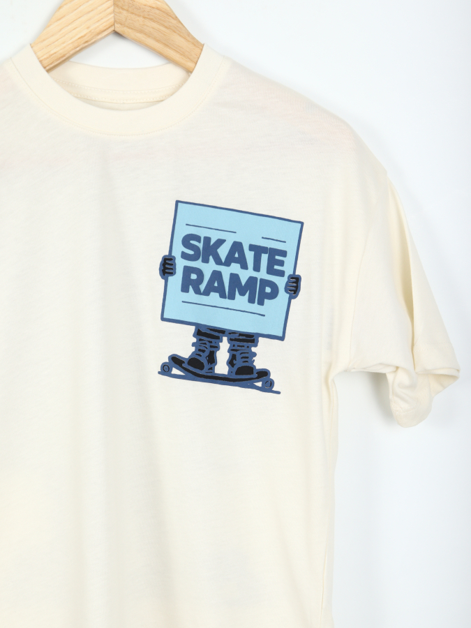 This boys' t-shirt is designed for comfort and style in everyday wear. Featuring a classic cream color, short sleeves, and a crew neckline, it offers a cool and breathable option for warm days. The playful "SKATE RAMP" graphic on both front and back captures the spirit of skateboarding culture, perfect for active kids. Made from soft, high-quality fabric, it ensures comfort throughout the day.