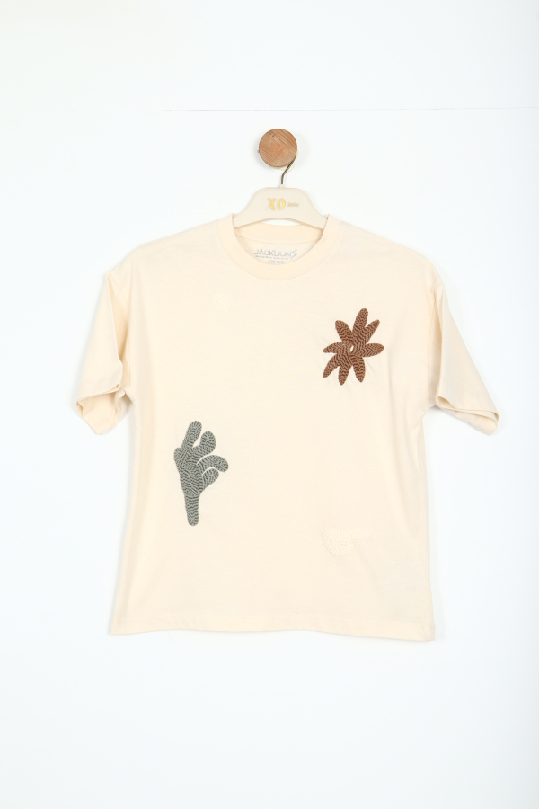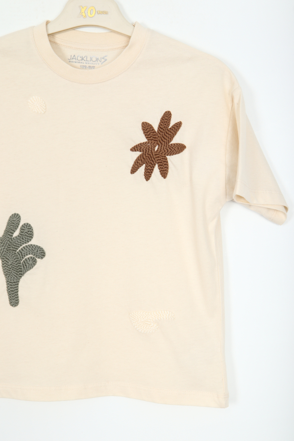 تتميز هذه القميص الأولاد بقصة مريحة وملمس ناعم مناسب للاستخدام اليومي. بأكمام قصيرة وياقة دائرية، توفر حرية الحركة. اللون الأساسي بيج مزود بزخارف منسوجة بألوان مختلفة تضفي مظهرًا أنيقًا ومميزًا على القميص. التصميم بسيط بدون قبعة أو سحاب أو جيوب، مما يجعله خيارًا عمليًا وأنيقًا.