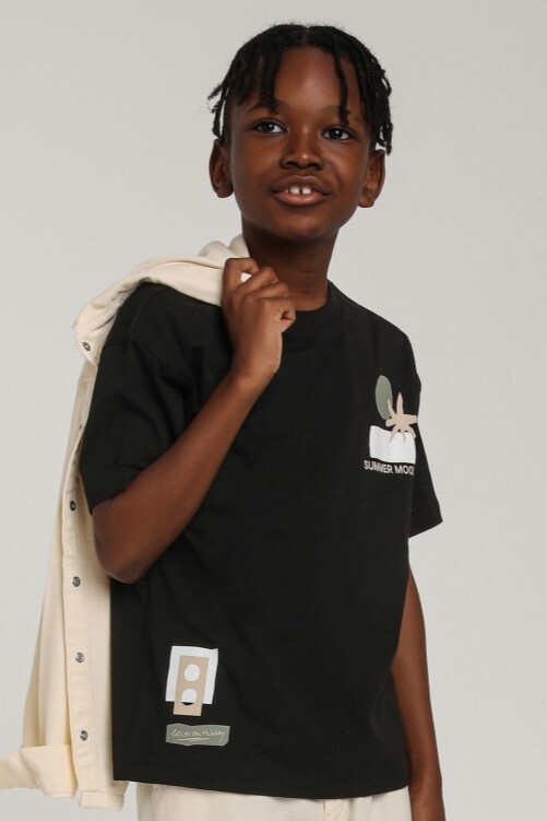 تي شيرت الأولاد العصري هذا يوفر مظهرًا أنيقًا ومريحًا لأشهر الصيف. مع لونه الأسود والطباعة الجذابة، من المؤكد أنه سيلقى إعجاب الأطفال من جميع الأعمار.