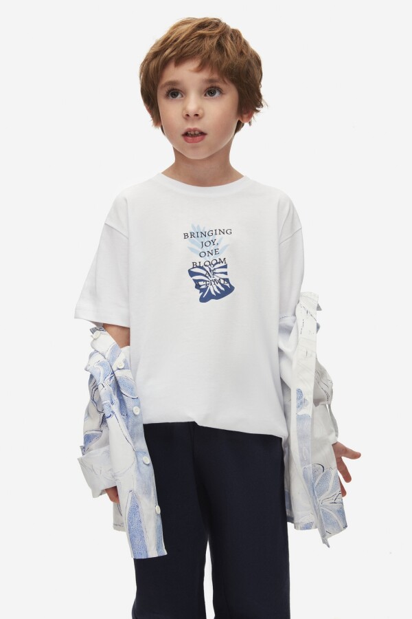 Bu şık erkek çocuk tişörtü, yaz aylarında rahat bir kullanım sunuyor. Ön ve arka yüzeyinde bulunan eğlenceli baskı, çocukların neşesini yansıtmakta. Beyaz rengi ile çeşitli kombinler yapma imkanı tanıyor.
