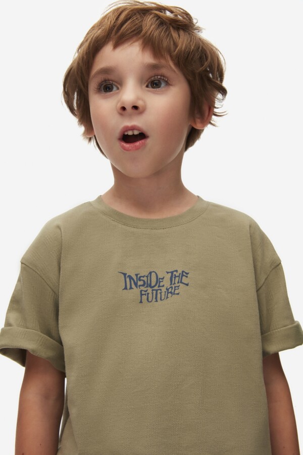 Çocuklarınız için ideal bir seçeneği sunan bu haki tişört, rahat ve şık bir görünüm sağlar. "Inside The Future" yazısı ile dikkat çeken tasarımı, hem gündelik hem de sportif kombinlere uyum sağlar.