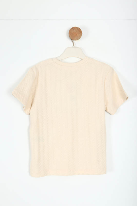 Bu krem rengi erkek çocuk tişörtü, günlük kullanıma uygun sade ve şık tasarımıyla dikkat çekiyor. Kısa kollu ve bisiklet yaka yapısı sayesinde hareket özgürlüğü sağlarken, ön taraftaki küçük cep detayı hem işlevsel hem de estetik bir dokunuş katıyor. Hafif kabartmalı dokusu tişörte farklı bir hava verirken, alt köşedeki küçük işlemeli patch ile sevimli bir detay eklenmiş. Çocukların rahatça kullanabileceği, konforlu ve şık bir günlük tercih.