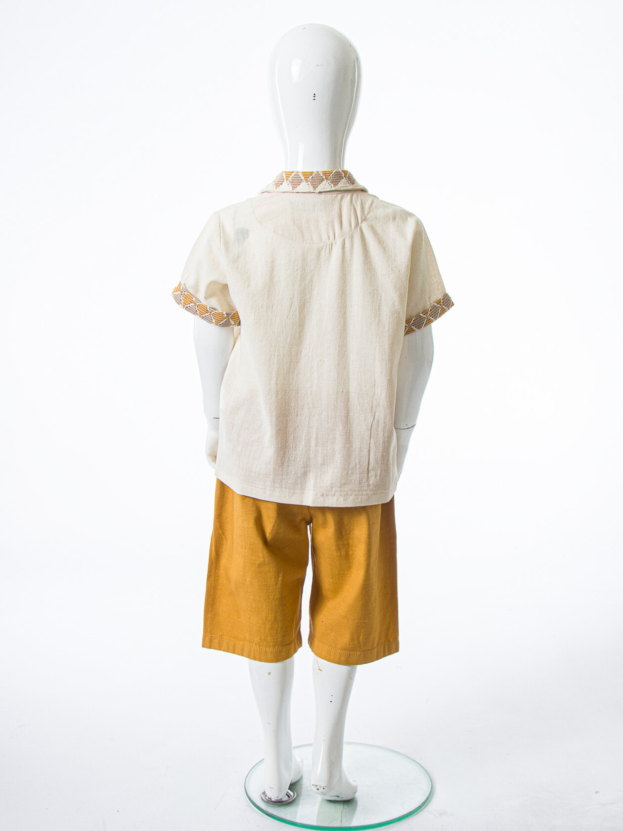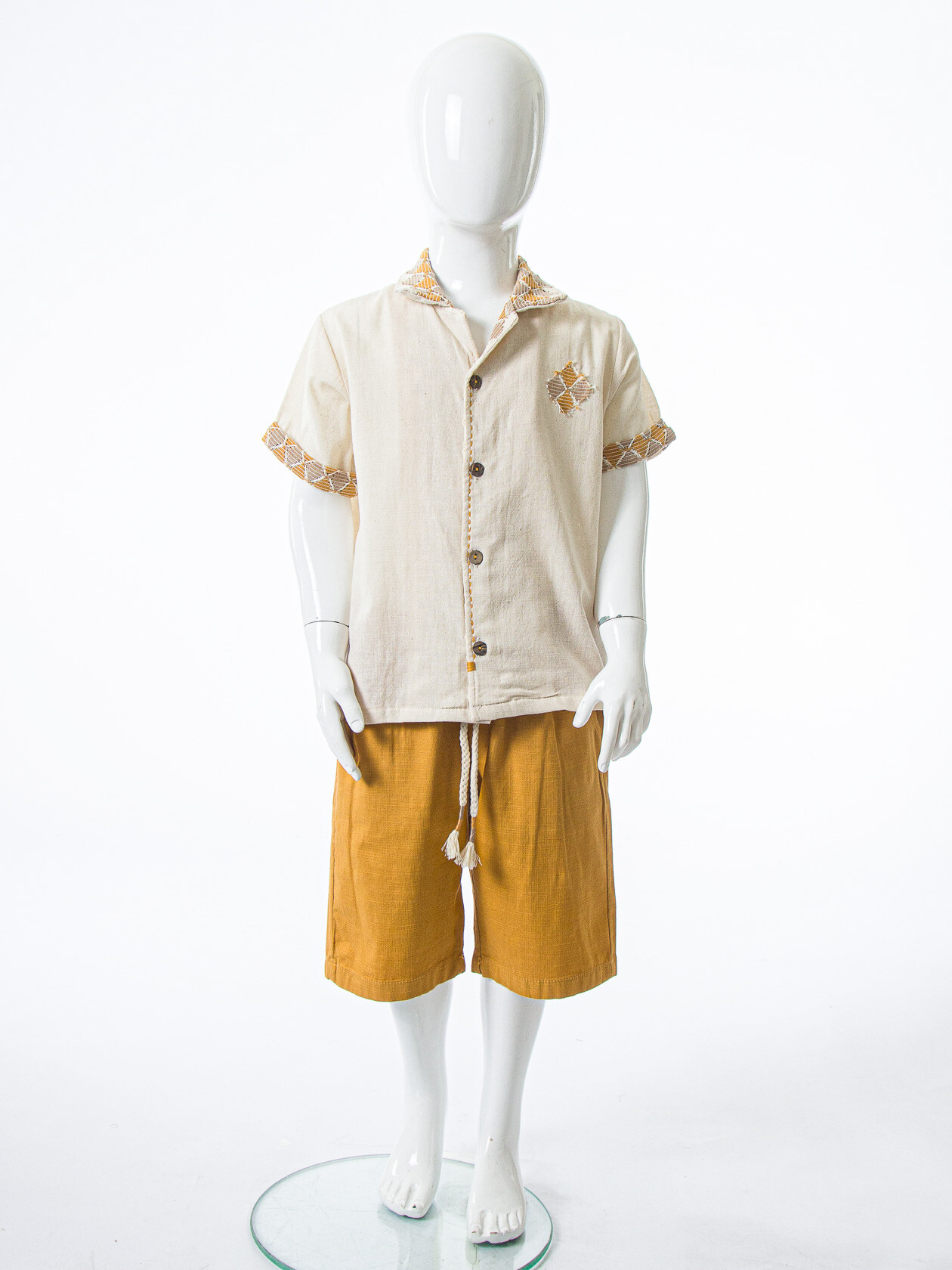 - Üst kısım, kısa kollu ve düğme kapamalı, şık bir yakaya sahip.