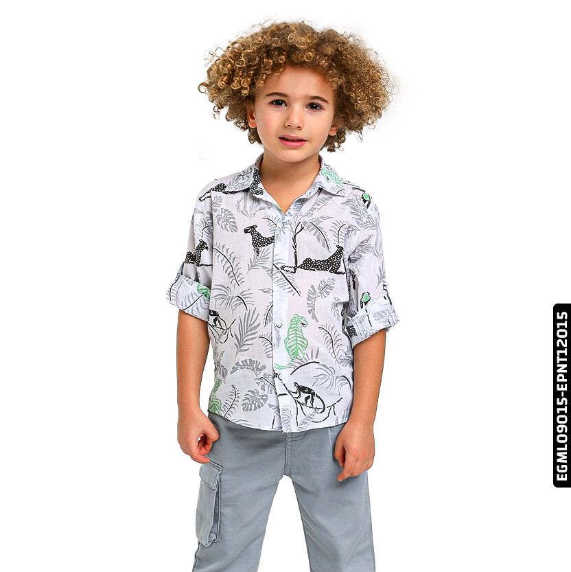 Bu erkek çocuk gömleği, yaz ayları için ideal hafif ve nefes alabilen bir kumaştan üretilmiştir. Kapüşonsuz, klasik yaka tasarımıyla şık ve rahat bir görünüm sunar. Düğmeli ön kapaması sayesinde pratik kullanım sağlar. Uzun kollu yapısı çocukların hem korunaklı hem de stil sahibi olmasını mümkün kılar. Beyaz zemin üzerine haki ve siyah tonlarda doğa temalı yaprak ve leopar desenleri gömleğe hareket katmaktadır.