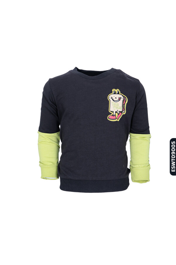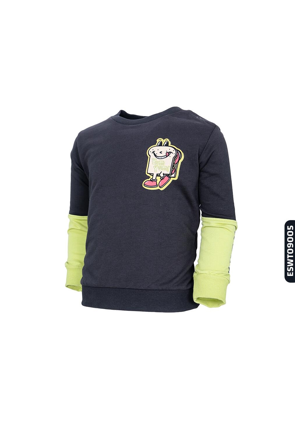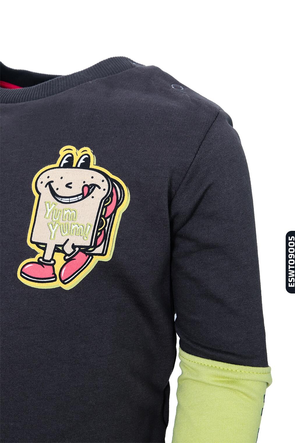 Bu erkek çocuk sweatshirt, rahat ve şık tasarımıyla kış ayları için ideal bir tercih. Kapüşonsuz, sıfır yaka yapısıyla kolay giyilip çıkarılabilir. Siyah gövde üzerinde hardal sarısı detaylar özellikle kolların alt kısmında renkli bir kontrast yaratıyor. Ön tarafta "Yum Yum!" yazılı, neşeli ve sevimli bir sandviç karakteri baskısı bulunmakta. Uzun kollu ve ribanalı manşetlere sahip bu sweatshirt, günlük kullanımda sıcak tutarken çocuklara hareket özgürlüğü sağlıyor.