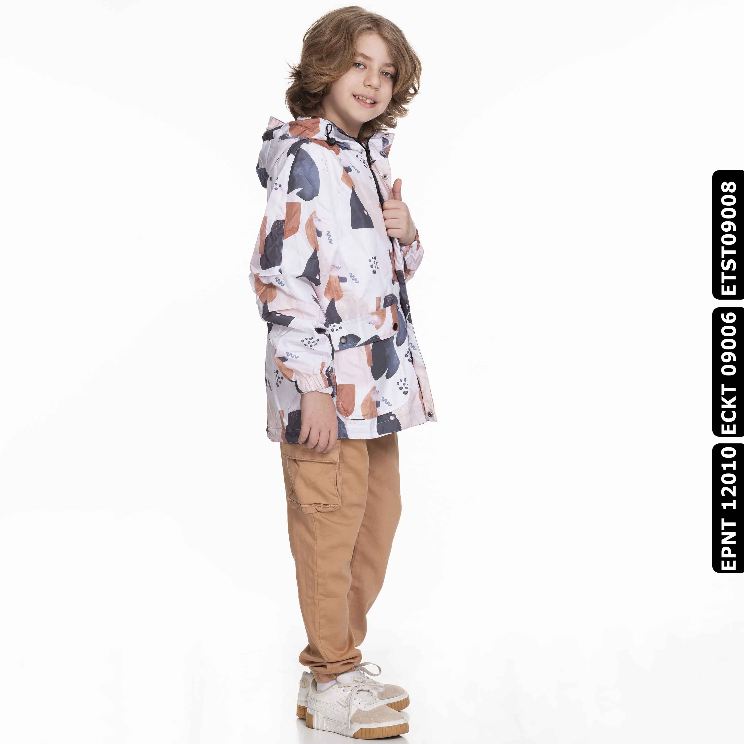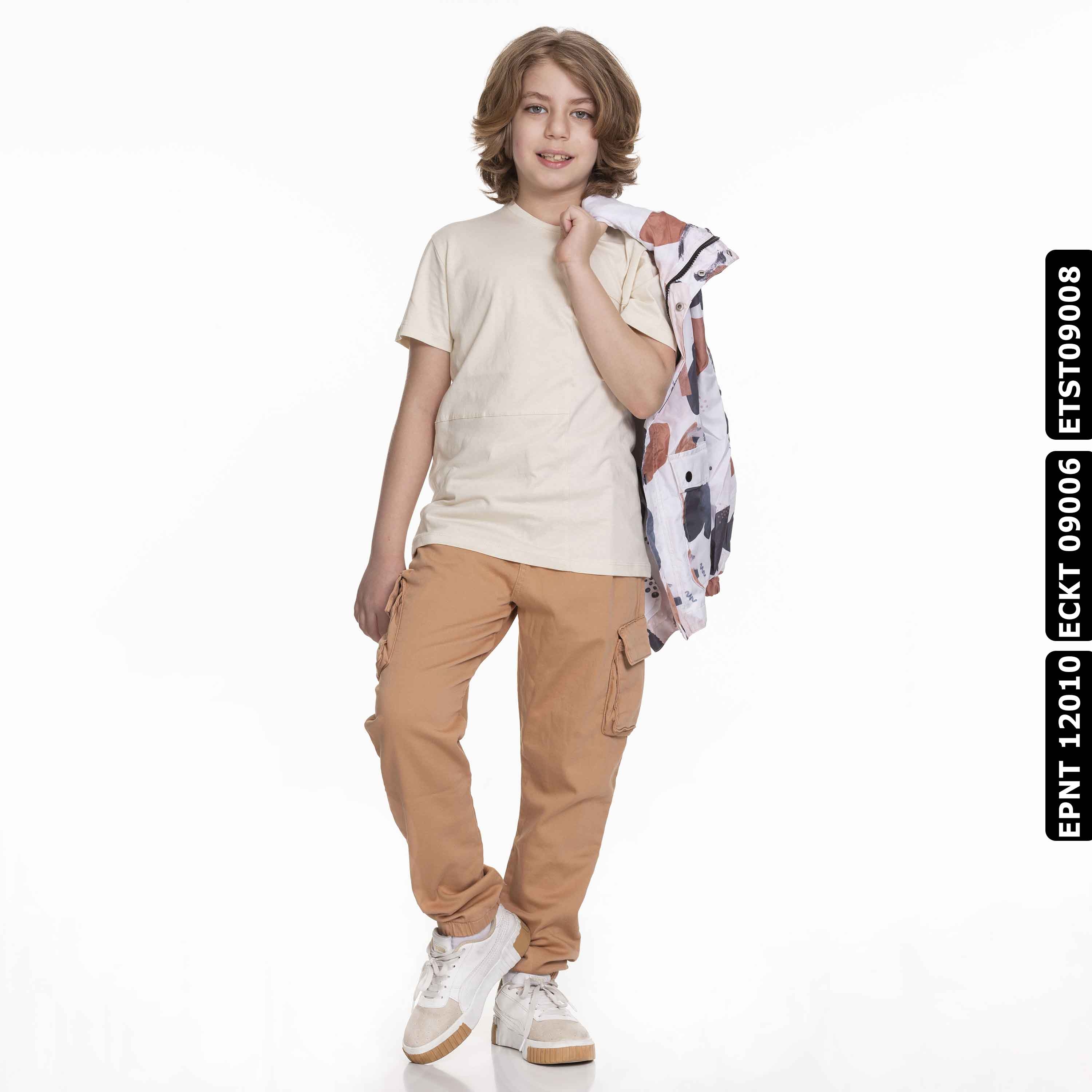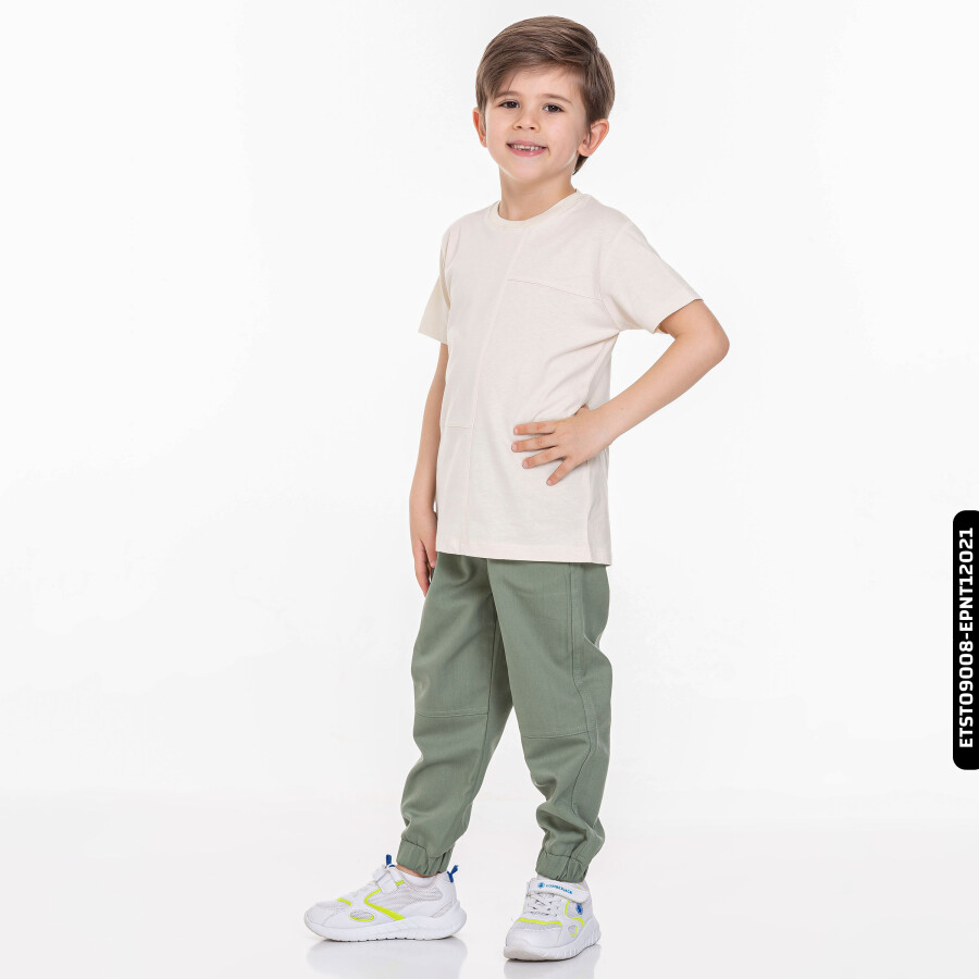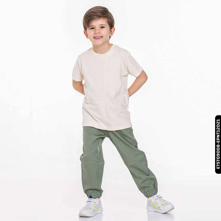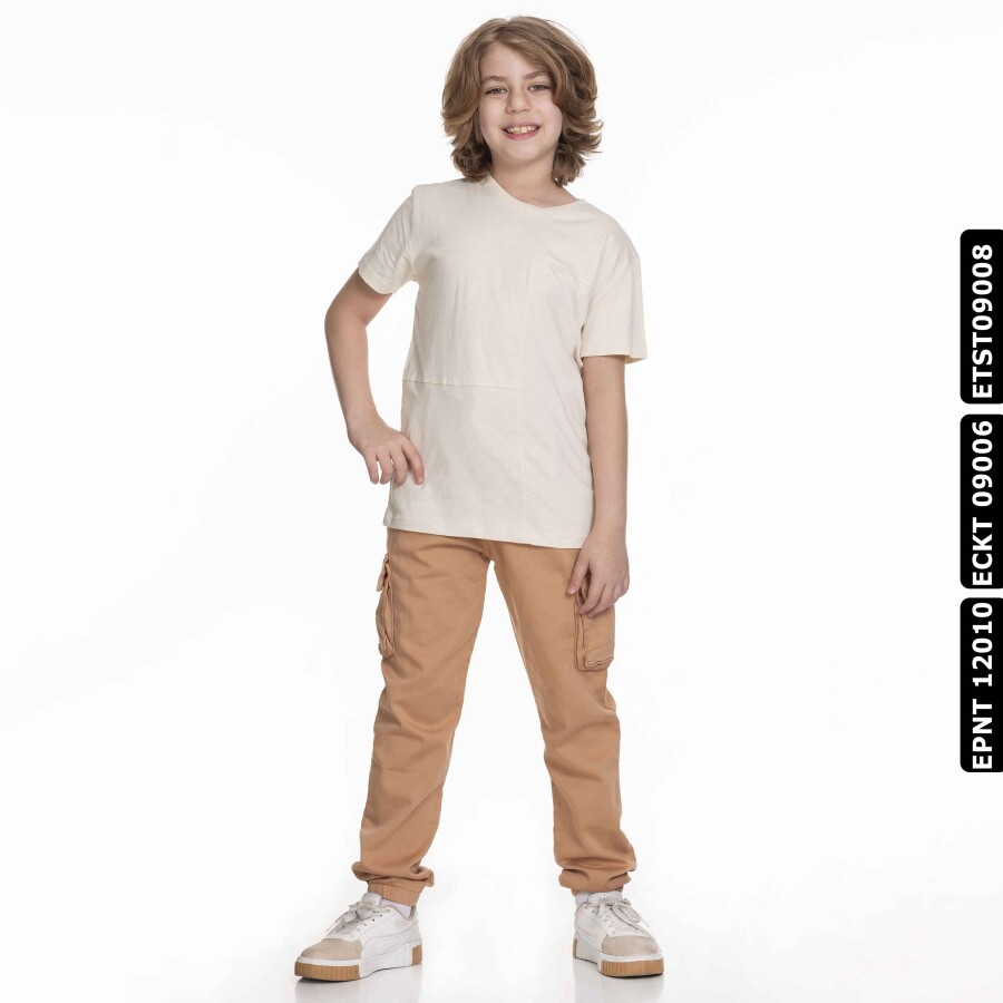 Bu krem rengi erkek çocuk tişörtü, yaz ayları için ideal olan hafif ve nefes alabilir bir kumaştan üretilmiştir. Sıfır yakalı ve kısa kollu tasarımıyla rahat bir kullanım sunar. Ön kısmında yer alan dekoratif dikiş detayları ve küçük cep, tişörte şık ve modern bir görünüm kazandırır. Günlük spor veya casual kombinlerde rahatlıkla tercih edilebilir.