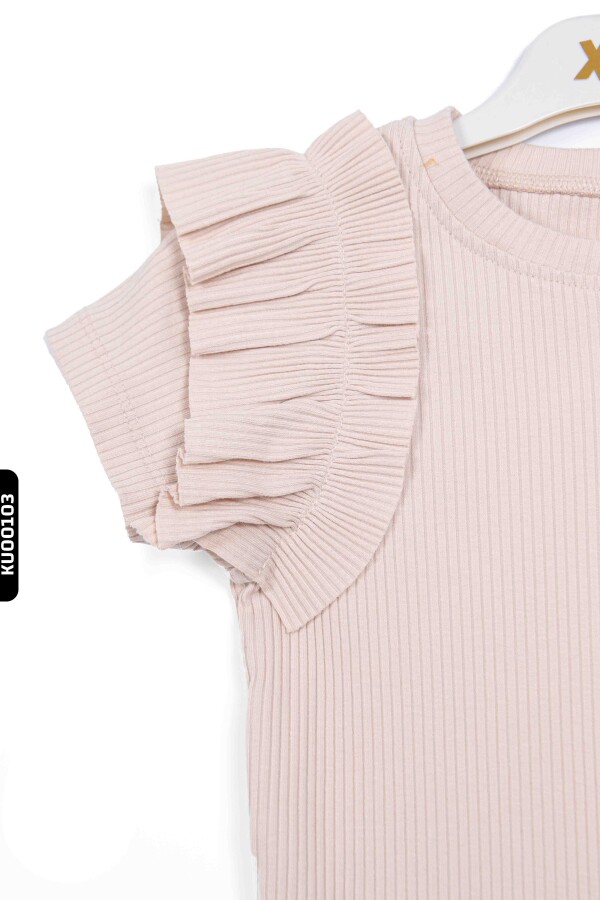 Fırfırlı Kısa Kollu O Yakalı Çizgili Kız Çocuk Kazak 5-14 Yaş 35773 Pudra