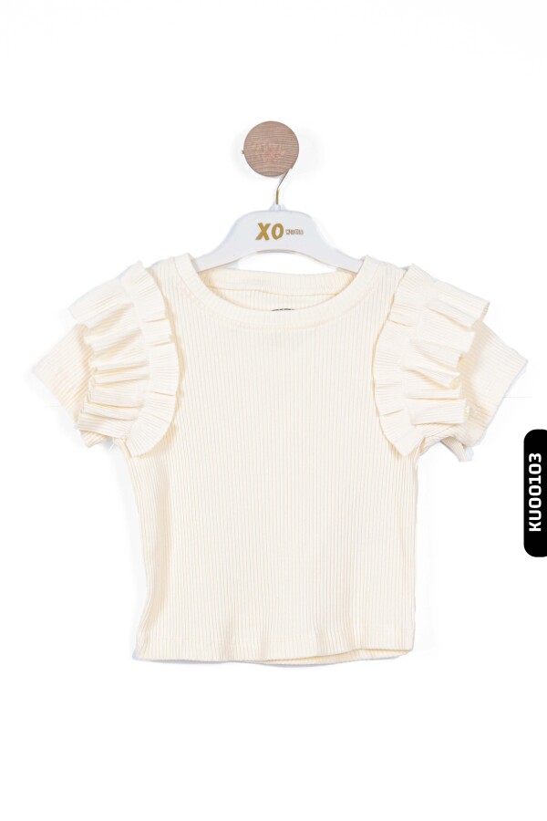 Fırfırlı Kısa Kollu O Yakalı Çizgili Kız Çocuk Kazak 5-14 Yaş 35773 Ekru