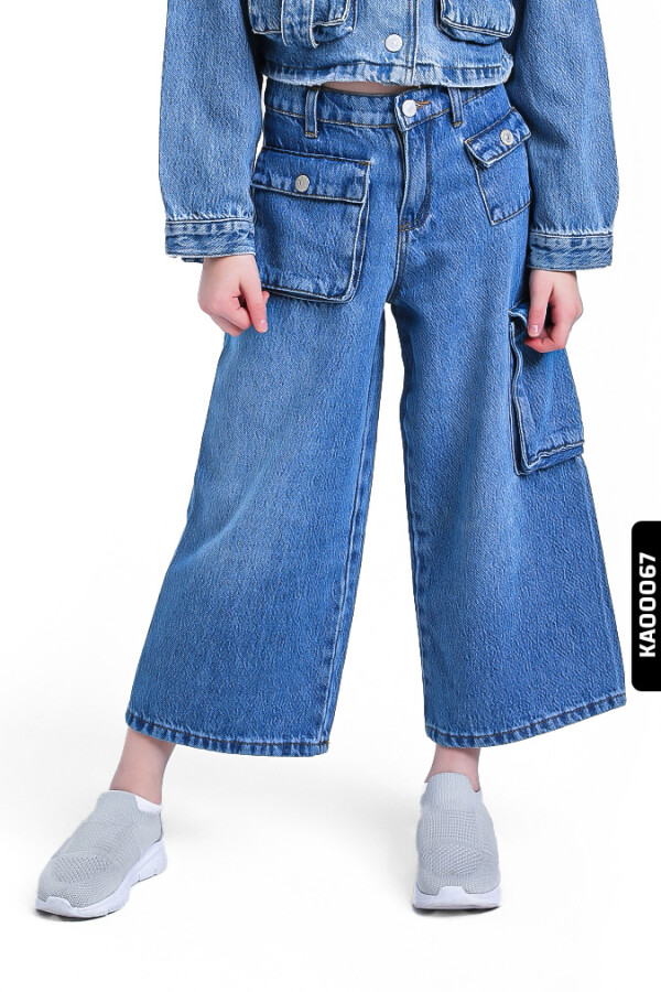 Geniş Paçalı Kargo Cepli Yüksek Belli Kız Çocuk Pantolon 5-14 Yaş 2452 Mavi