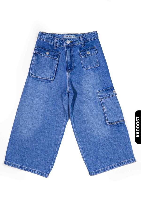 Geniş Paçalı Kargo Cepli Yüksek Belli Kız Çocuk Pantolon 5-14 Yaş 2452 Mavi - 1