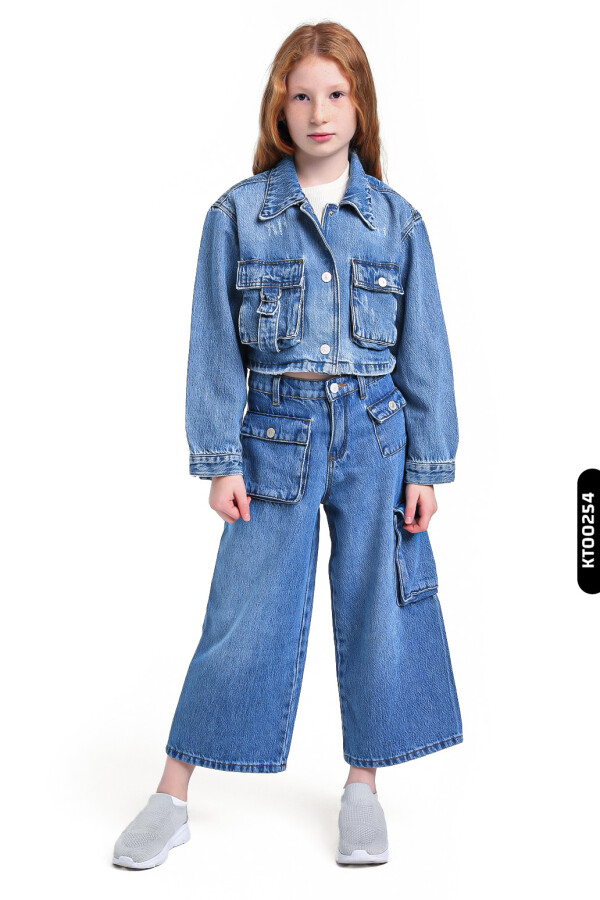 Geniş Paçalı Kargo Cepli Yüksek Belli Kız Çocuk Pantolon 5-14 Yaş 2452 Mavi - 7