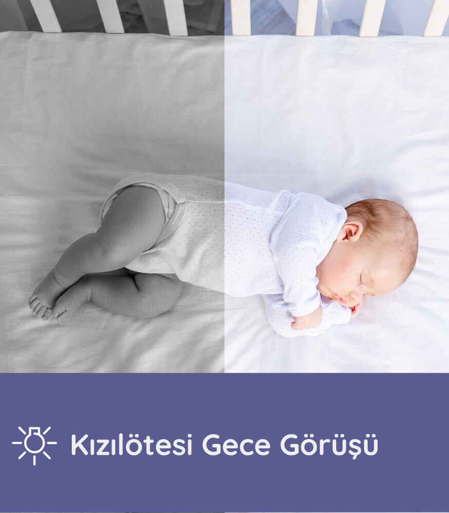Önceden yüklenmiş hazır ninnilerle bebeğinizin uyumasını kolaylaştırırken, kızılötesi gece görüşüyle karanlık ortamda bile bebeğinizi izlemenin tadını çıkarabilirsiniz.