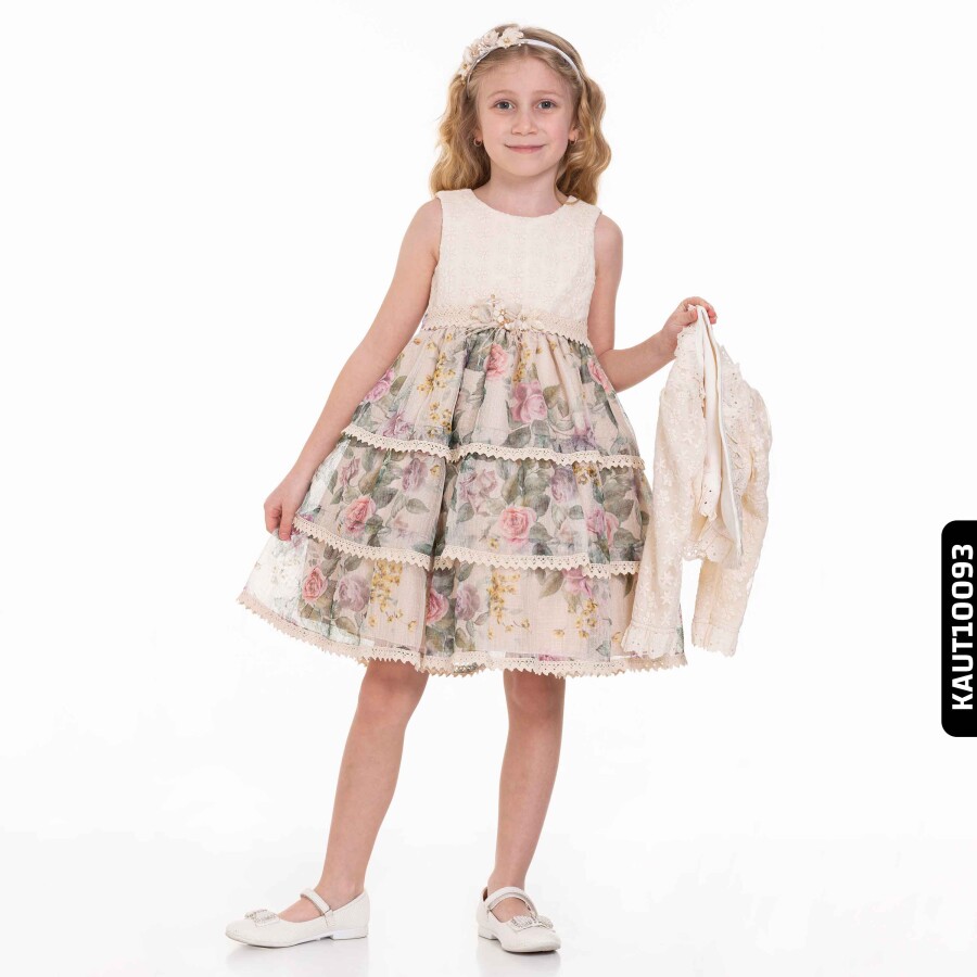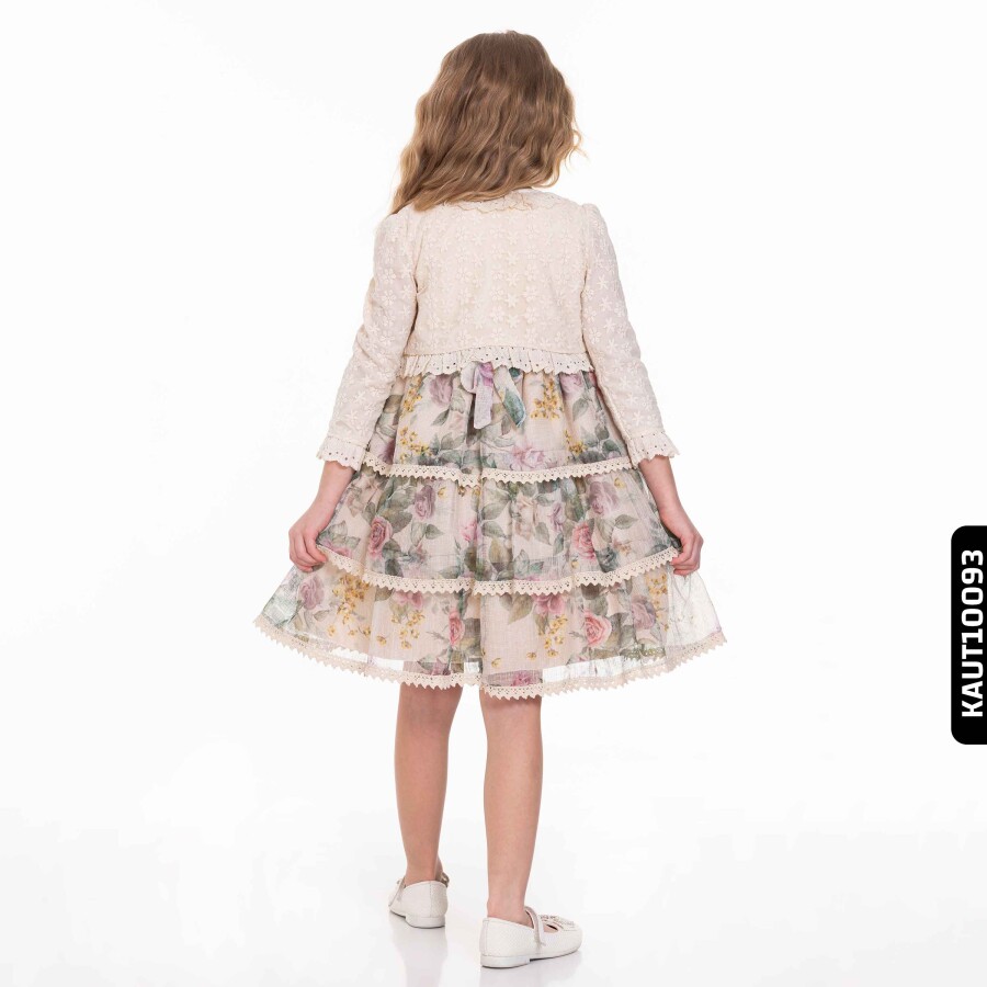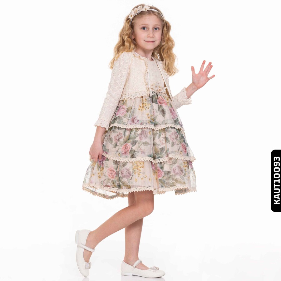 Bu kız çocuk elbisesi, yaz ayları için mükemmel bir seçimdir. Elbisenin üst kısmı ekru renginde ve çiçek desenli tül kumaşla süslenmiş, alt kısmı ise kat kat ve çiçek desenleriyle hareketlendirilmiştir. Uzun kollu, kolsuz olarak iki şekilde kullanılabilen şık bolero ceketle birlikte gelir. Yuvarlak yaka tasarımı ve diz boyu uzunluğu, rahat ve zarif bir görünüm sunar. Elbise, özel günler ve davetler için ideal, romantik ve zarif bir stile sahiptir.