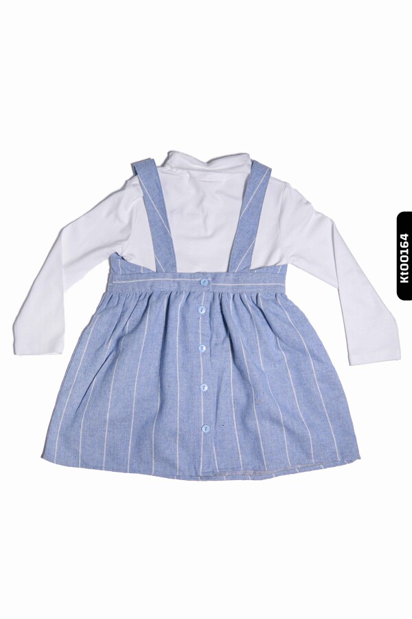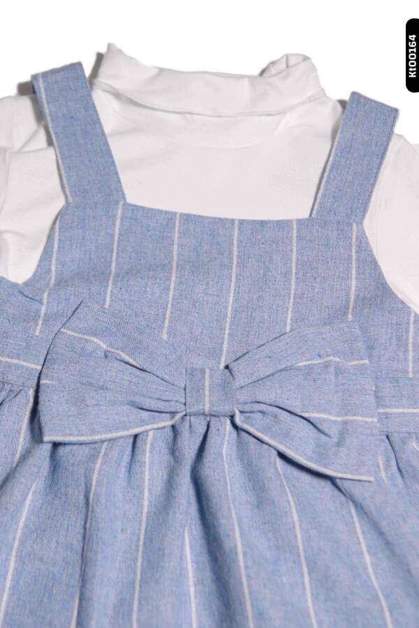 Bu kız çocuk jilesi, şık ve rahat tasarımıyla kış aylarında tercih edebileceğiniz harika bir üründür. Üst kısmı beyaz renkli, uzun kollu ve sıfır yakalı bir iç giyim parçasıyla kombinlenmiştir. Üstten askılı, lacivert zemin üzerinde ince beyaz çizgiler bulunan jile, bele oturan büyük fiyonk detayı ile zarif bir görünüm sunar. Jilenin arka kısmında düğme detayı bulunmaktadır. Rahat kesimi ve kaliteli kumaşı sayesinde çocukların hareket özgürlüğünü kısıtlamaz.