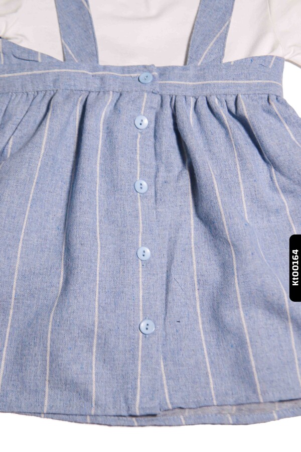 • Lacivert ve beyaz çizgili askılı jile, belde büyük fiyonk ve arka düğme detaylı