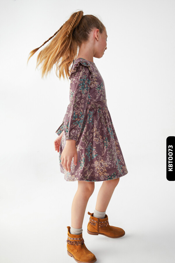 Bu kız çocuk elbisesi, kış sezonu için ideal bir tercihtir. Mor tonlarında, zarif çiçek desenleriyle süslenmiş olan elbise, uzun kollu ve sıfır yakalı tasarımıyla hem şık hem de rahat kullanım sunar. Omuzlarda bulunan fırfırlı detaylar elbiseye hareket katar. Belden hafifçe oturan kesimi ve midi boy uzunluğu sayesinde çocukların rahatça hareket etmesini sağlar. Fermuar veya düğme bulunmayan elbise, kolay giyilip çıkarılabilir. Günlük kullanımda veya özel günlerde şık bir seçim olacaktır.