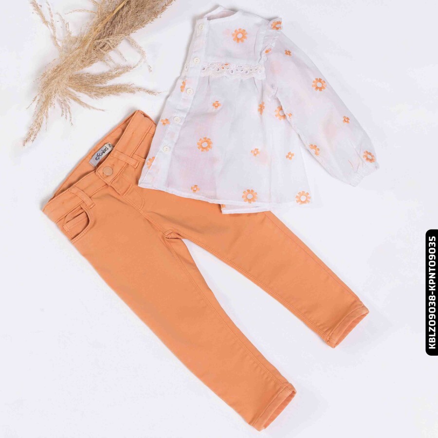 Bu zarif kız çocuk bluz takımı, yaz ayları için mükemmel bir seçimdir. Bluz, uzun kollu ve bisiklet yaka tasarımı ile rahatlık sağlar. Vizon renk tonunda, bej çiçek desenleriyle süslenmiş olup, ön tarafta dantel detaylı düğmeli kapama bulunur. Üst kısmında küçük fırfır detayları da şıklık katar. Alt kısmındaki pantolon ise somon tonlarında, rahat kesimli ve paçaları hafif kıvrımlıdır. Bu takım, hem şık hem de gün boyu konfor sunar.