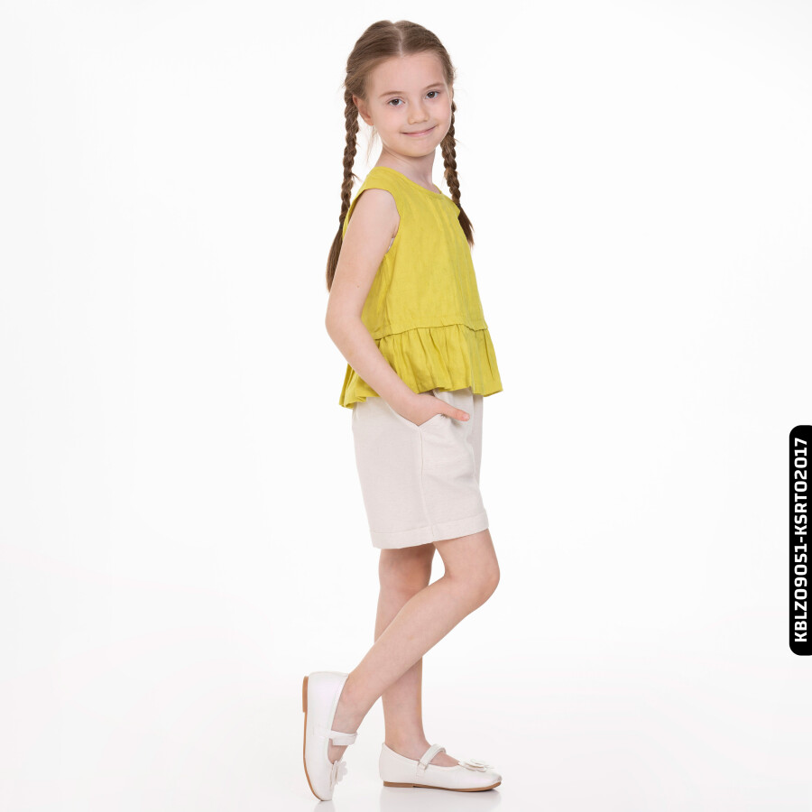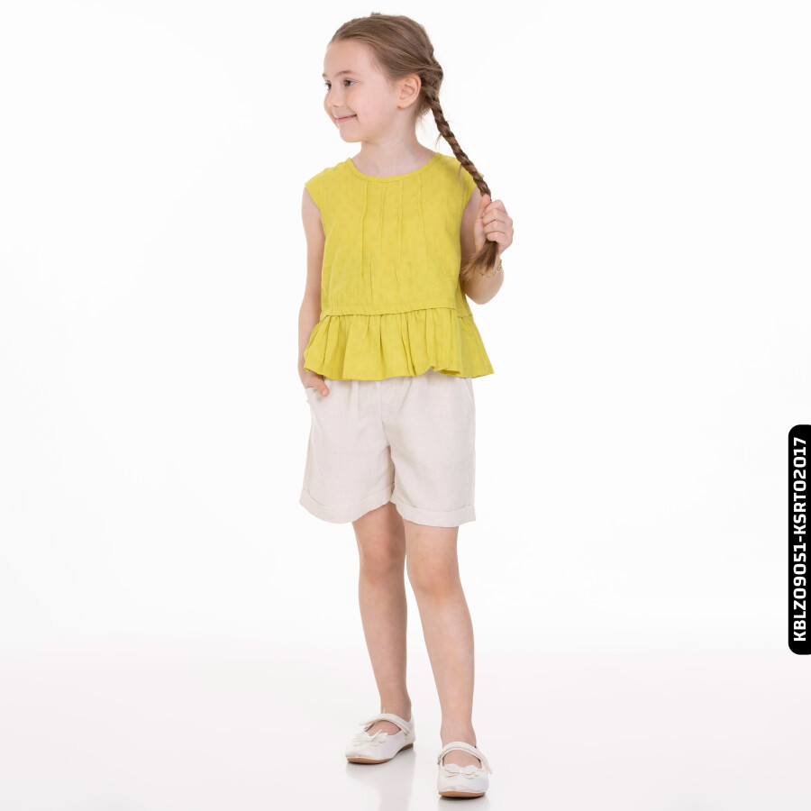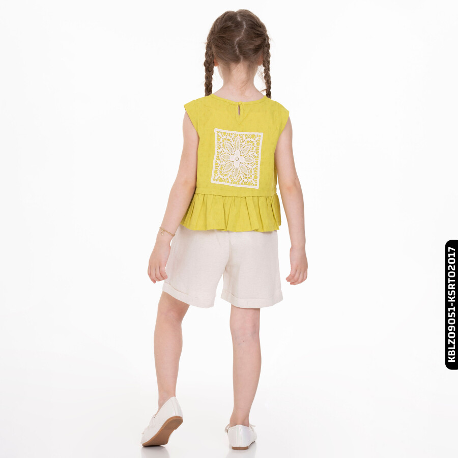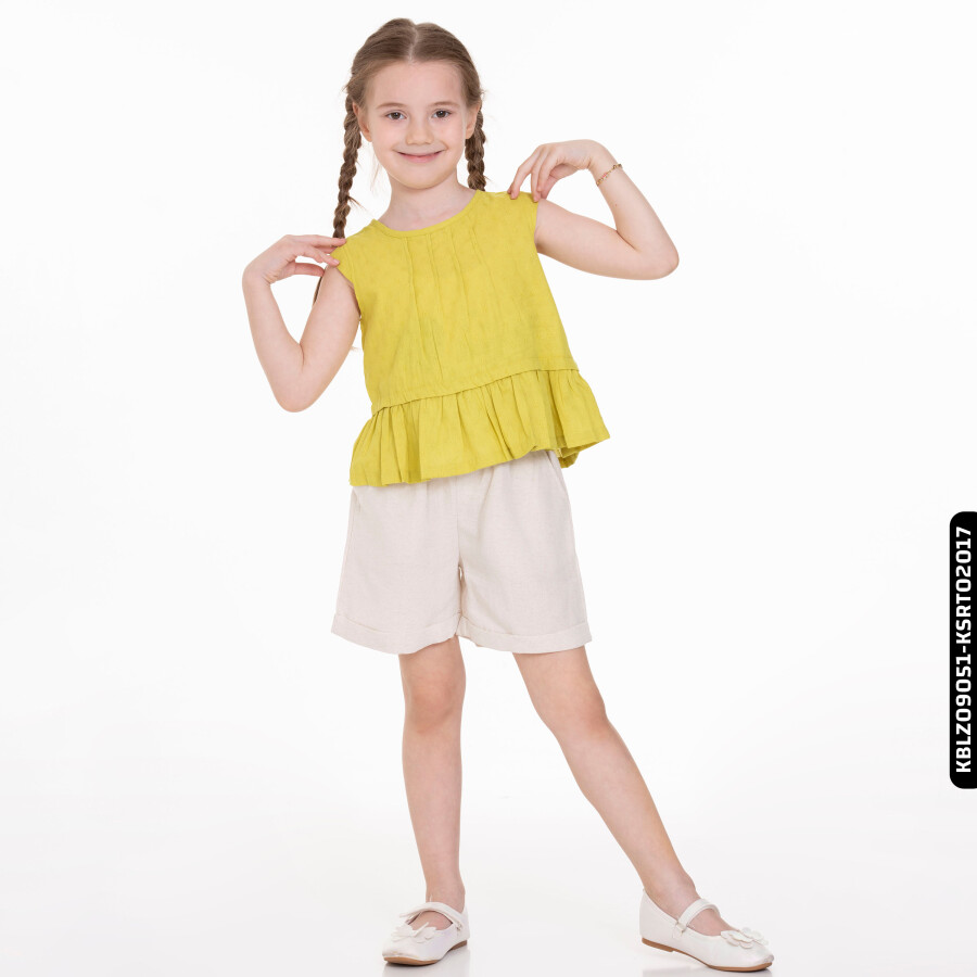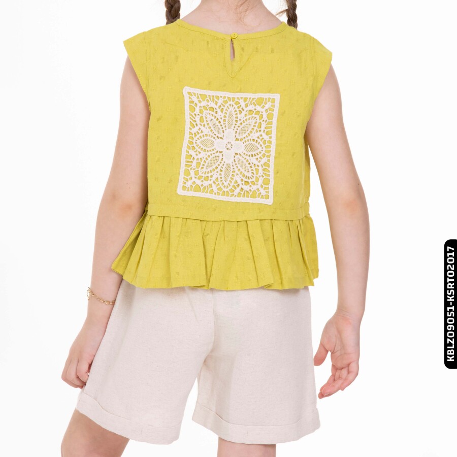 Yaz ayları için özel olarak tasarlanmış bu kız çocuk bluzu, nefes alabilir hafif kumaşı ve rahat kesimi ile çocuğunuzun konforunu ön planda tutar. Kolsuz yapısı ve bisiklet yaka detayı ile sıcak havalarda serin kalmasını sağlar. Ön tarafta ince pile detayları ve etek ucu volanlı şıklık, bluzun zarif ve neşeli görünmesini sağlar. Arkada yer alan dantel işleme, ürünün özgün ve şık bir dokunuşa sahip olmasını sağlar. Canlı yeşil rengi, yaz kombinlerine enerji katacak ve çocuğunuzun hareket özgürlüğünü destekleyecek şekilde tasarlanmıştır.
