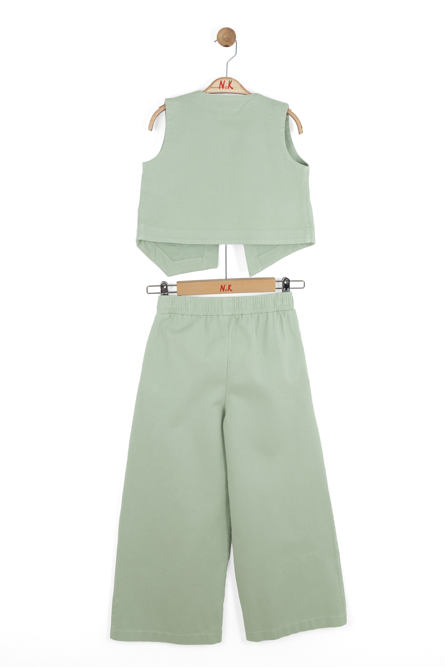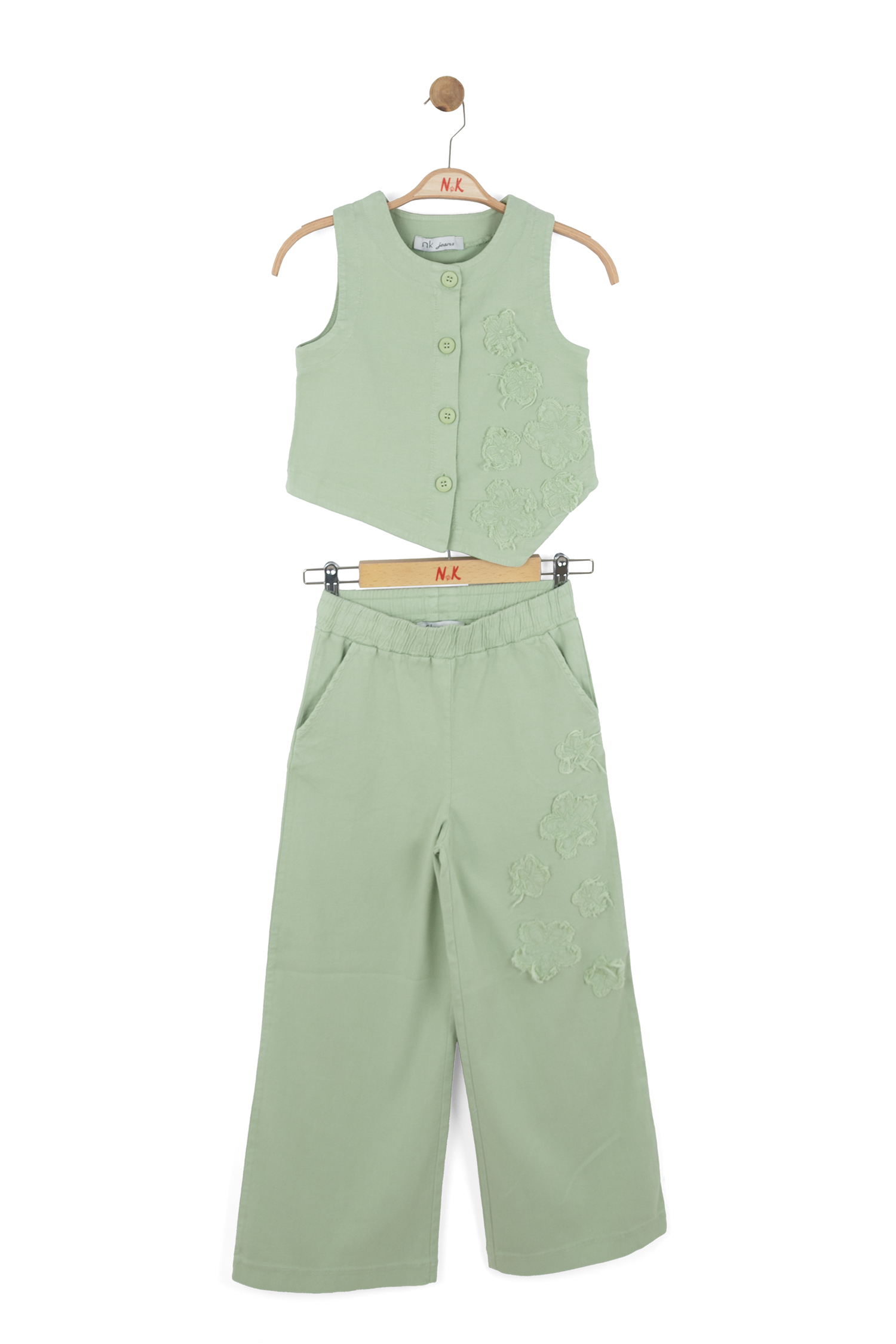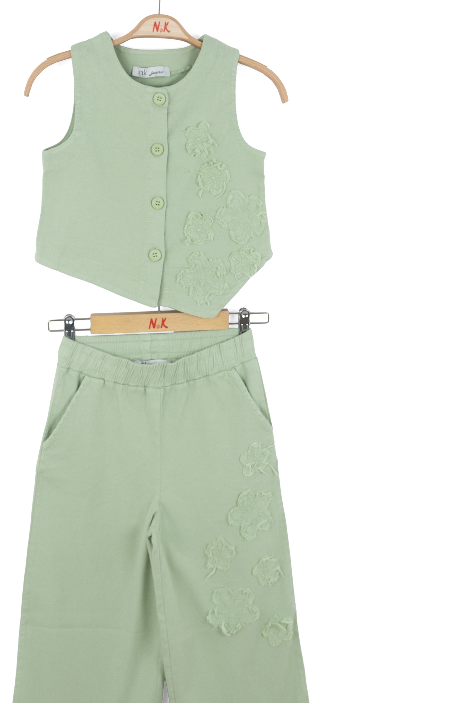 Bu kız çocuk alt üst takımı, bahar sezonu için ideal bir seçimdir. Takım, yeşilin yumuşak ve ferahlatıcı tonunda tasarlanmıştır. Üst parça, düğmeli ve kolsuz bir yelek şeklindedir. Yeleğin önünde ve pantolonun bir yanında, hoş ve dikkat çekici çiçek işlemeleri bulunur. Pantolon, bol kesim ve uzun boyda, rahat bir kullanım sağlar. Elastik bel bandı sayesinde çocukların hareket özgürlüğü korunur. Takım, spor ve şık bir tarzı bir araya getirerek günlük kullanıma uygundur.