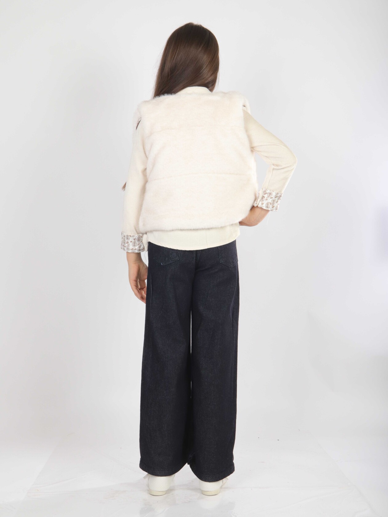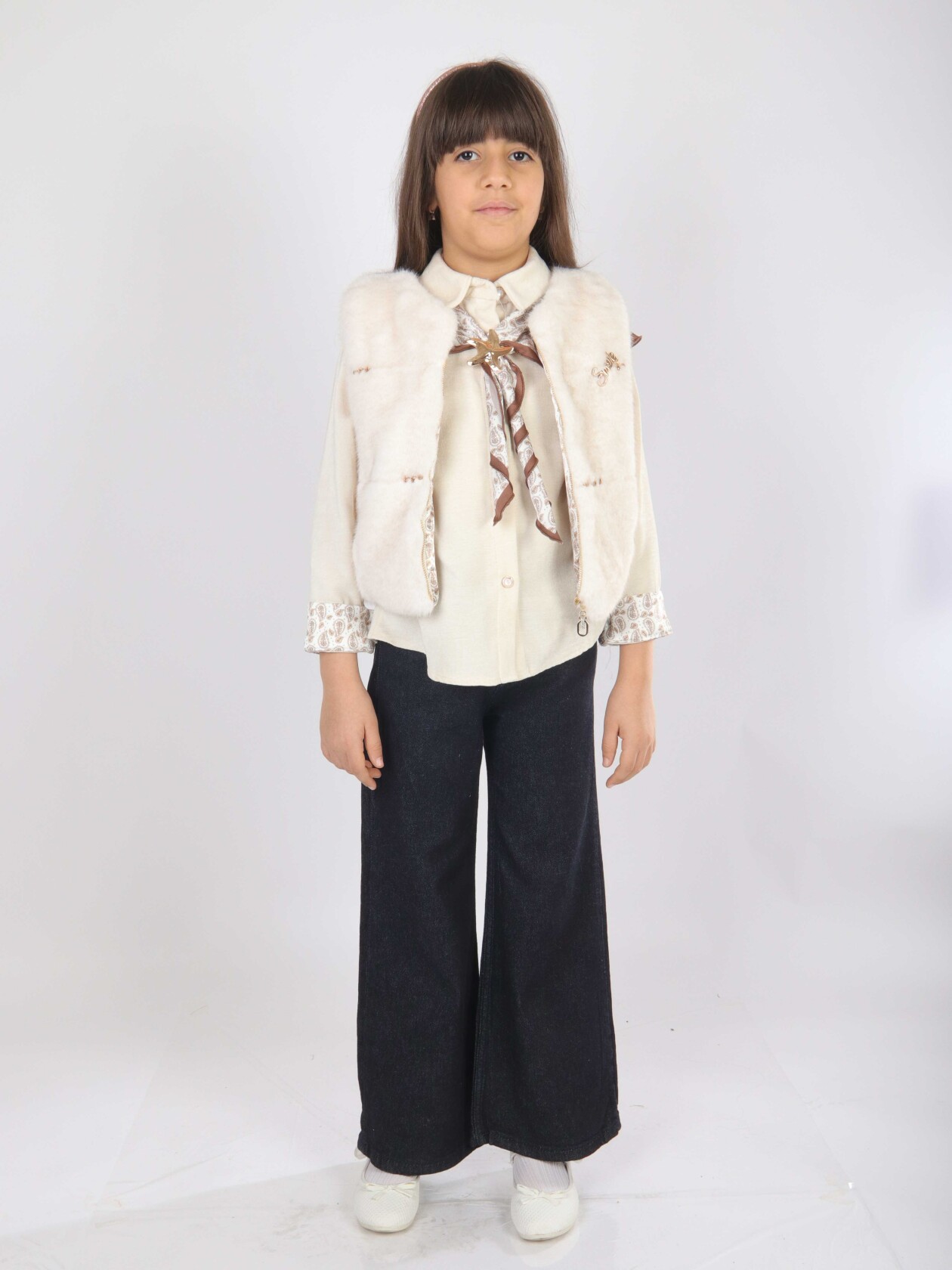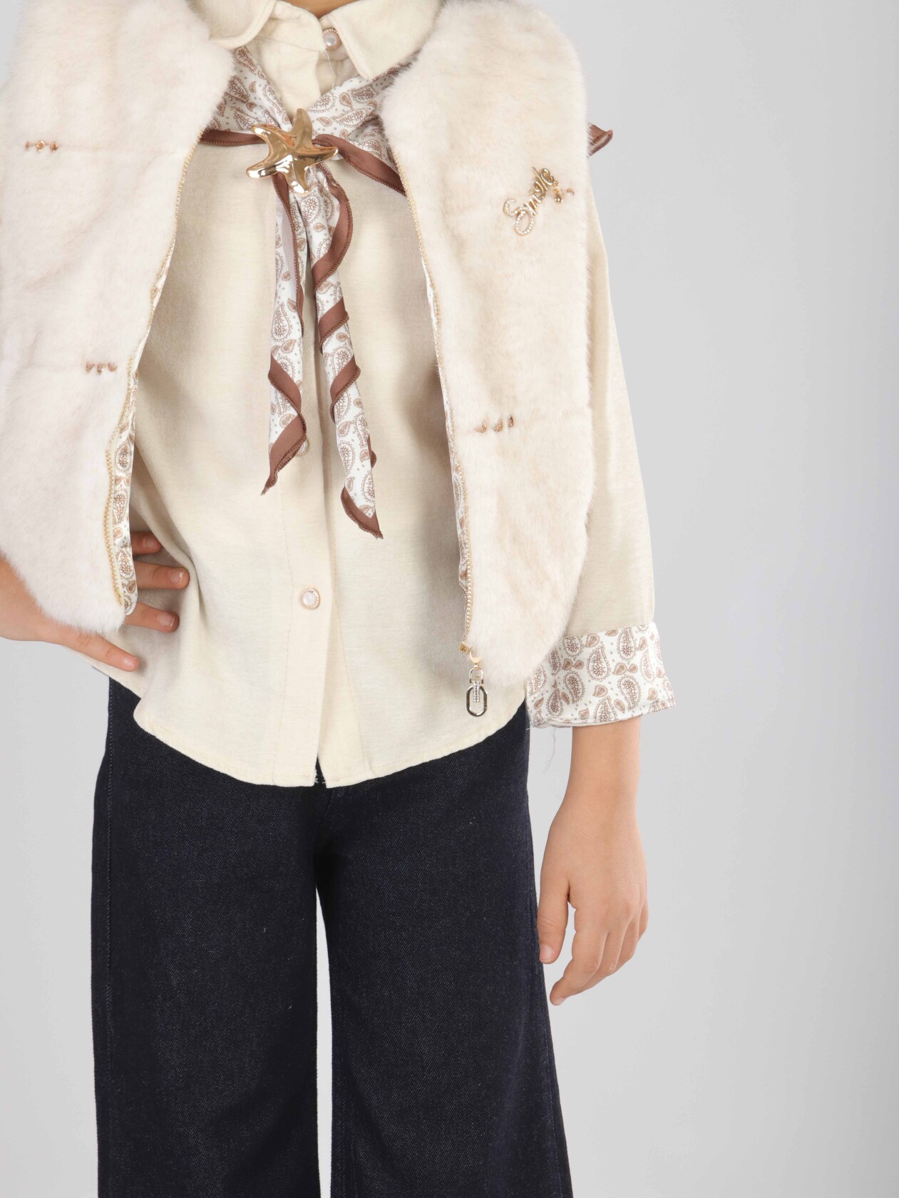 Bu kız çocuk alt üst takımı, bahar mevsimi için şıklığı ve rahatlığı bir arada sunuyor. Üst parça, düğmeli ve uzun kollu olup, kol manşetlerinde ve omuzda şal şeklinde kullanılan desenli kumaş detaylarıyla zarif bir görünüm sağlıyor. Takımda bulunan ekru rengi peluş yelek, sıcaklık katarken modern bir dokunuş yapıyor. Alt parça ise geniş paça, koyu denim pantolon şeklindedir ve günlük kullanıma uygun, rahat bir kesime sahiptir.