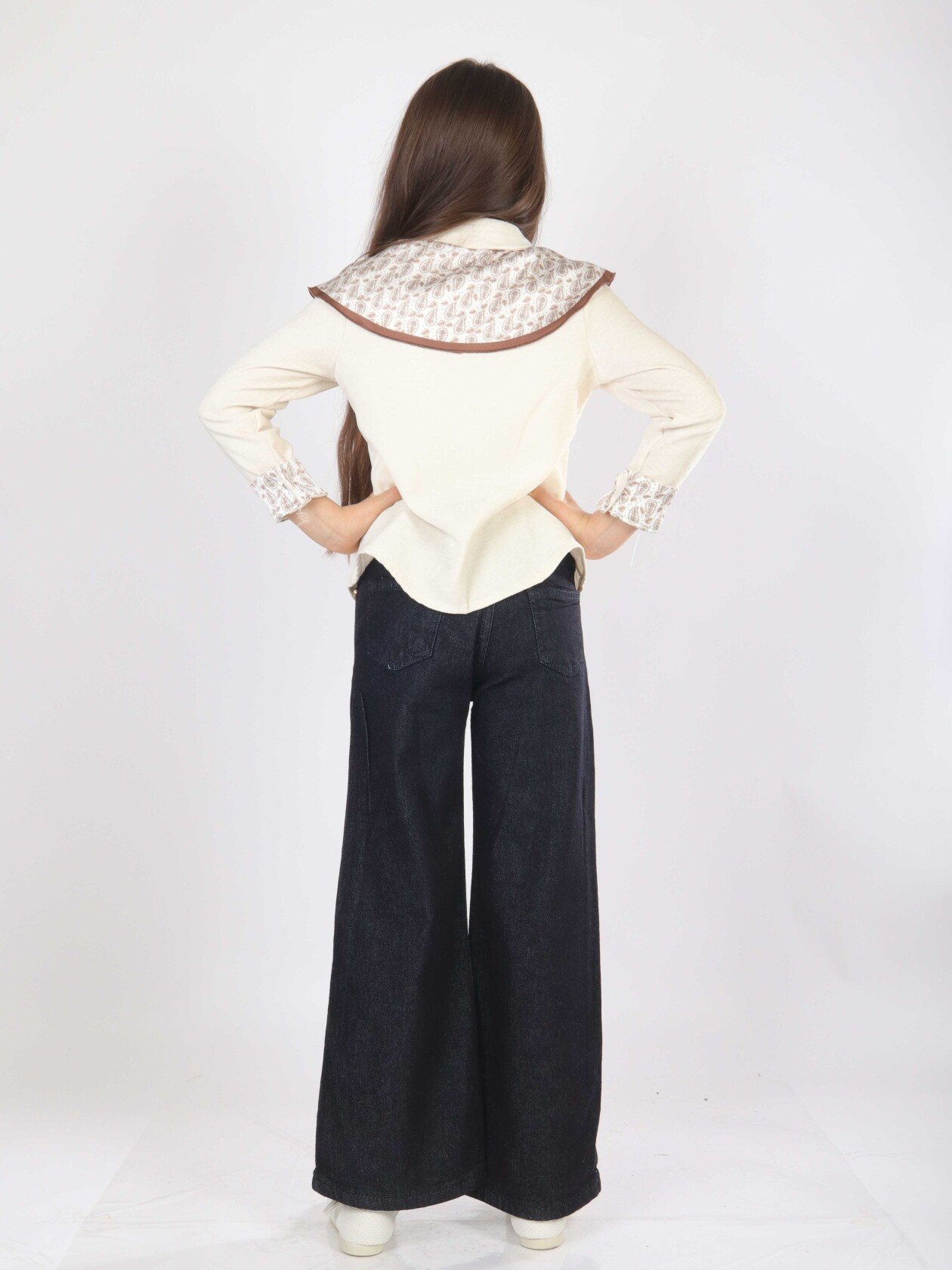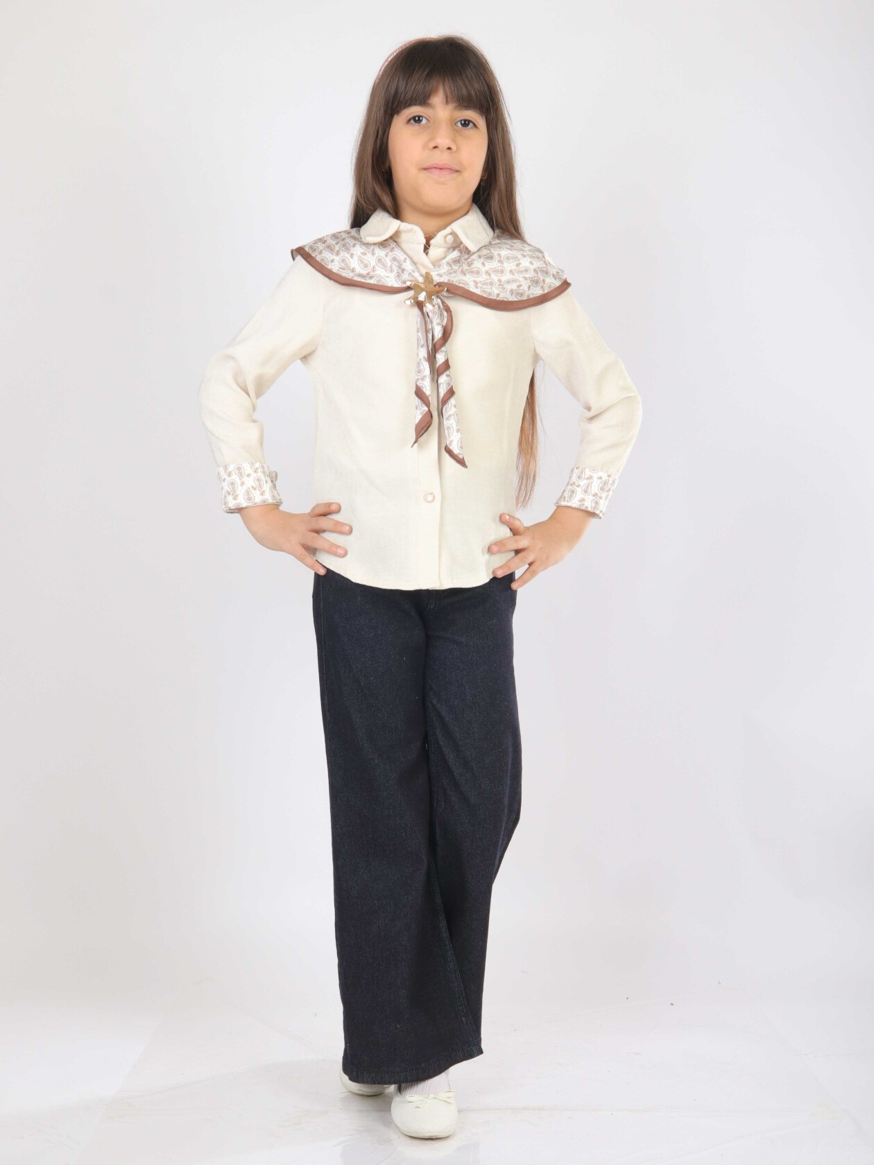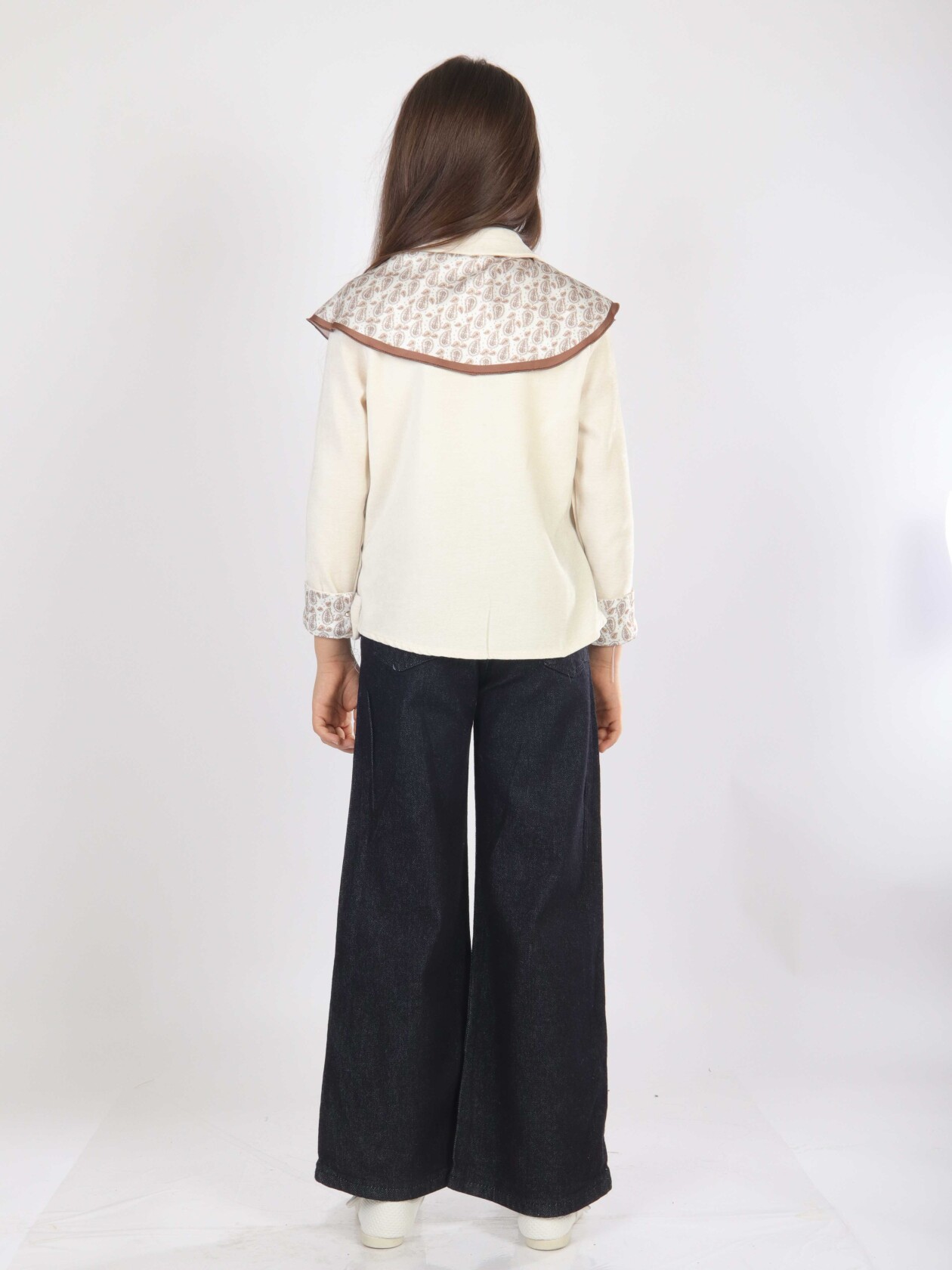 Bu kız çocuk alt üst takımı, bahar mevsimi için şıklığı ve rahatlığı bir arada sunuyor. Üst parça, düğmeli ve uzun kollu olup, kol manşetlerinde ve omuzda şal şeklinde kullanılan desenli kumaş detaylarıyla zarif bir görünüm sağlıyor. Takımda bulunan ekru rengi peluş yelek, sıcaklık katarken modern bir dokunuş yapıyor. Alt parça ise geniş paça, koyu denim pantolon şeklindedir ve günlük kullanıma uygun, rahat bir kesime sahiptir.