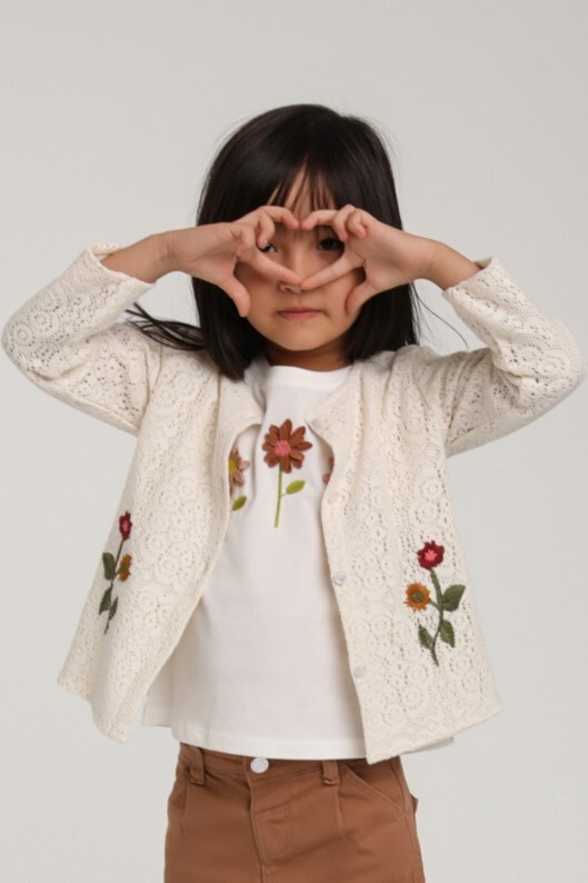 This stylish outfit for girls features a comfortable and elegant design, perfect for little ones. The set includes a t-shirt adorned with floral embroidery and a lace-detail cardigan that adds a fresh touch to your child's wardrobe.
