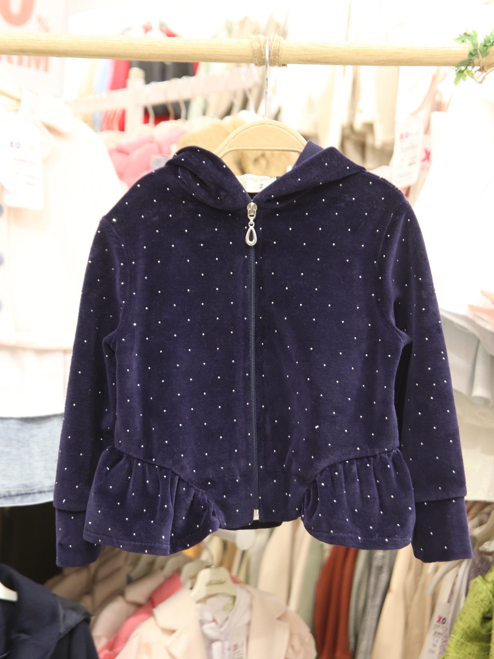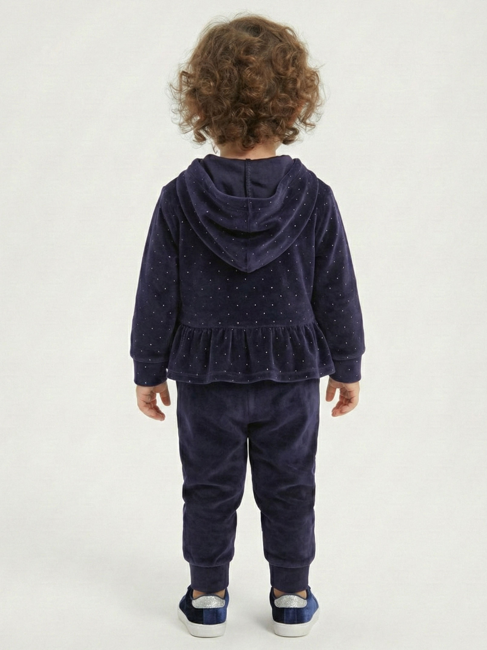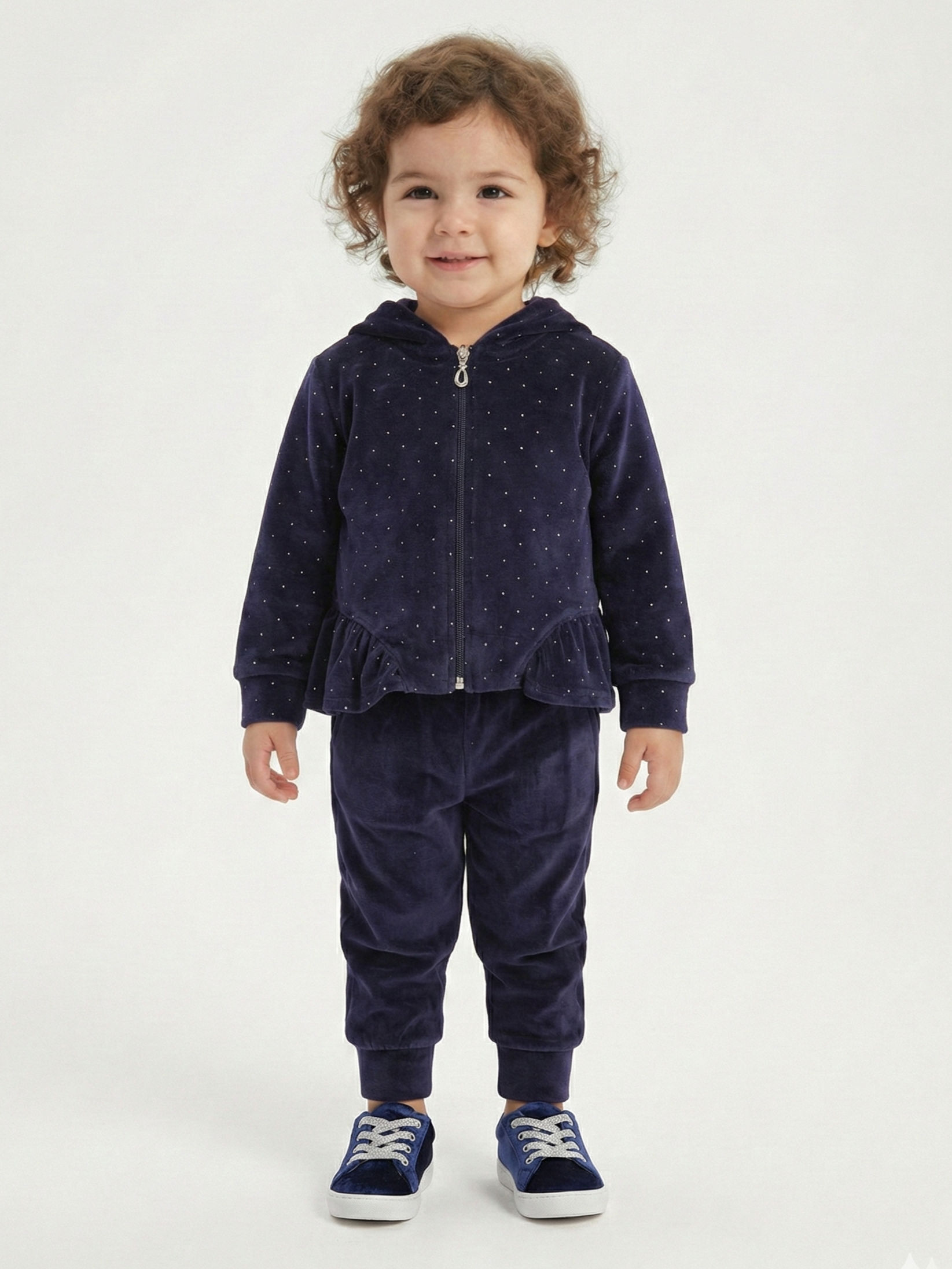 Bu kız çocuk alt üst takımı, yumuşak kadife kumaştan üretilmiş olup kış ayları için idealdir. Lacivert renkte olan takım, kapüşonlu ve fermuarlı üstü ile rahat kullanım sağlar. Ceket kısmında ince simli puantiye deseni ve bele doğru genişleyen fırfır detayı yer alır. Alt kısmı ise elastik paçalı ve konforlu kesimiyle hareket özgürlüğü sunar. Uzun kollu ve kapüşonlu tasarımı, soğuk havalarda ekstra koruma sağlar.