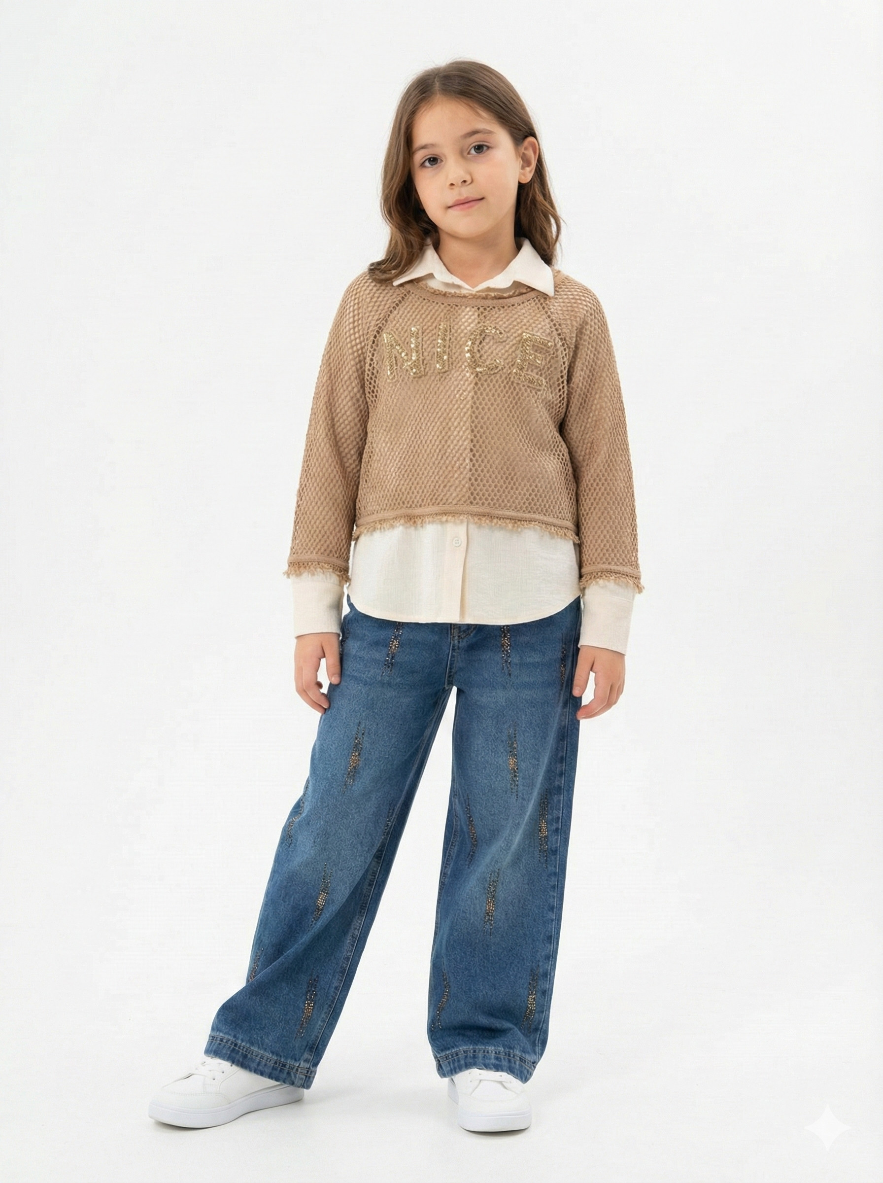 Bej Püsküllü Pançolu Gömlekli ve Bol Paça Pantolonlu 3'lü Kız Çocuk Takım 8-14 Yaş 4430 Ekru - Kahverengi