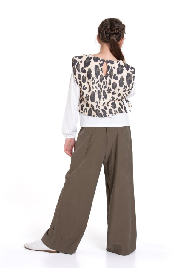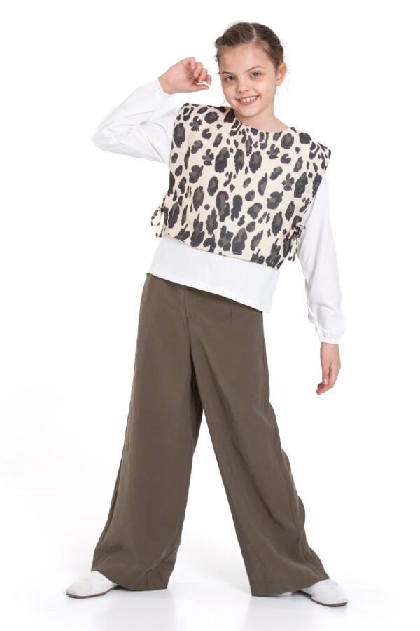 Bu şık kız çocuk pantolon takımı, hem rahat hem de modern bir görünüm sunuyor. Üst kısımda asimetrik bir leopar deseni bulunurken, alt kısımda geniş paçalı rahat pantolonlar yer alıyor. Çocukların günlük aktivitelerinde özgürce hareket etmelerini sağlarken, şıklıklarından da ödün vermemelerini sağlıyor.
