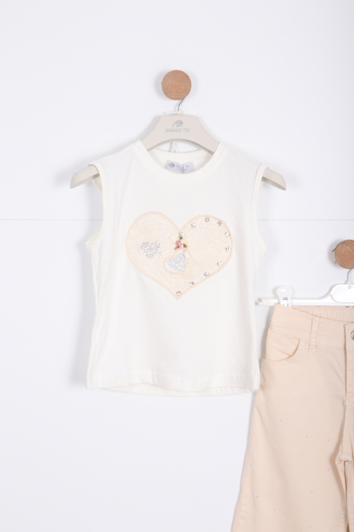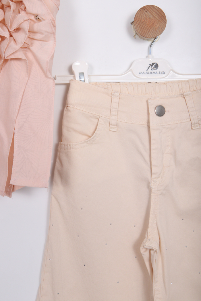 تعتبر مجموعة البنطلون هذه للفتيات خياراً مثالياً لعشاق الموضة الصغار. يتميز الجزء العلوي بتفاصيل أنيقة من الدنيم مع زينة من الحجارة اللامعة، مما يجعله جذابًا. البنطلون يوفر مقاسًا مريحًا مع الحفاظ على مظهر أنيق.