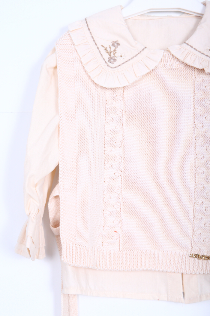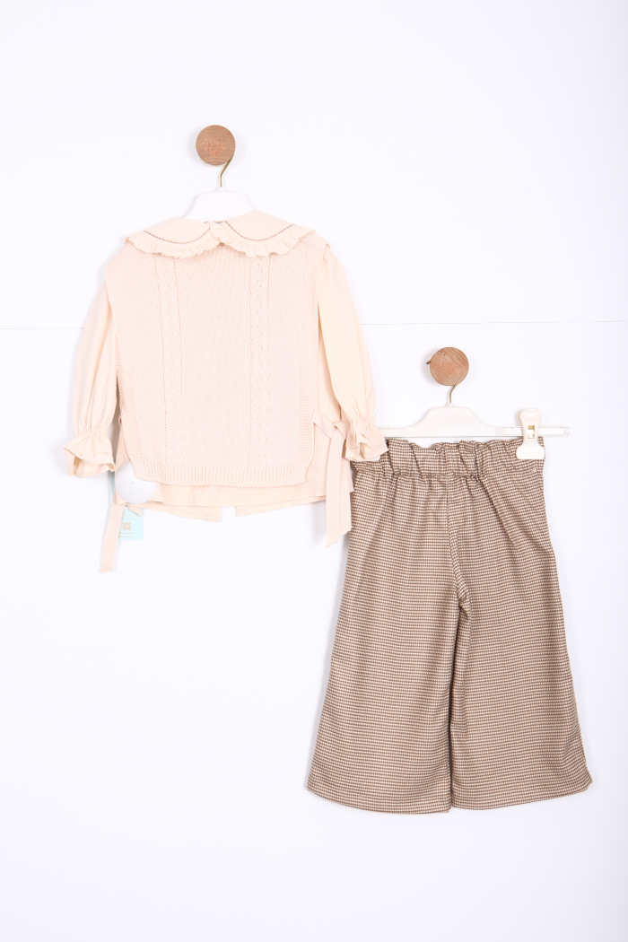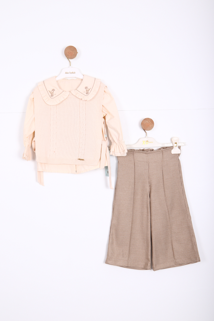 Bu sevimli kız çocuk pantolon takımı, şıklığı ve rahatlığı bir arada sunuyor. Üst kısmı zarif bir yaka ile süslenmiş ve dantel detaylarıyla zenginleştirilmiştir. Pamuklu kumaşı sayesinde, çocuğunuzun gün boyu rahat hissetmesini sağlar. Pantolon ise geniş kesimi ve şık desenleri ile dikkat çekiyor.