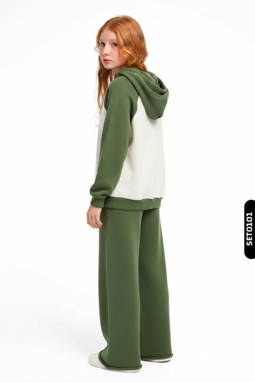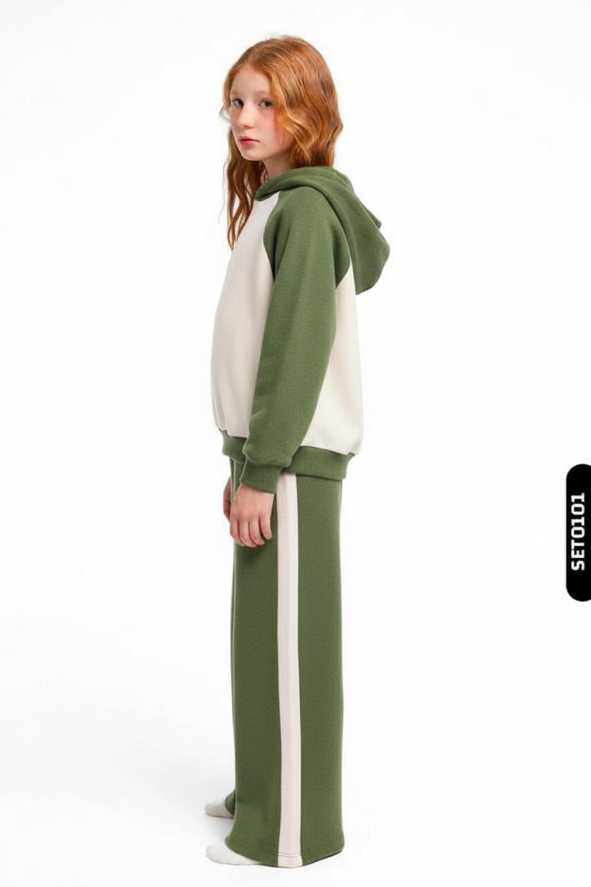 This girls' two-piece set offers both comfort and style during the winter months. The top features a hooded, drawstring design. This zipperless sweatshirt has long sleeves and a crew neck. The front is white with the word "CITY" and city-themed graphic prints. The sleeves and hood are khaki green, and the bottom has ribbed detailing. The bottom is khaki green, with a wide-leg cut and white stripe details on the sides for a sporty look. Overall, the set is suitable for everyday wear with its comfortable fit and modern design.