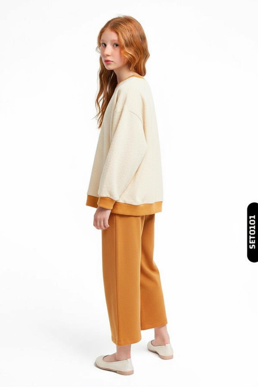Bu kız çocuk alt üst takımı, rahatlığı ve şıklığı bir arada sunuyor. Üst kısmı bej renginde olup, turuncu, kahverengi ve krem tonlarında çiçek desenleriyle süslenmiştir. Sıfır yaka ve uzun kollu olan üst, turuncu renkli manşet ve bele sahip. Alt kısmı ise turuncu renkli, bol kesim ve midi boy pantolondan oluşuyor. Takım, kış sezonu için ideal kalınlıkta ve yumuşak dokusuyla çocukların rahat hareket etmesini sağlıyor.