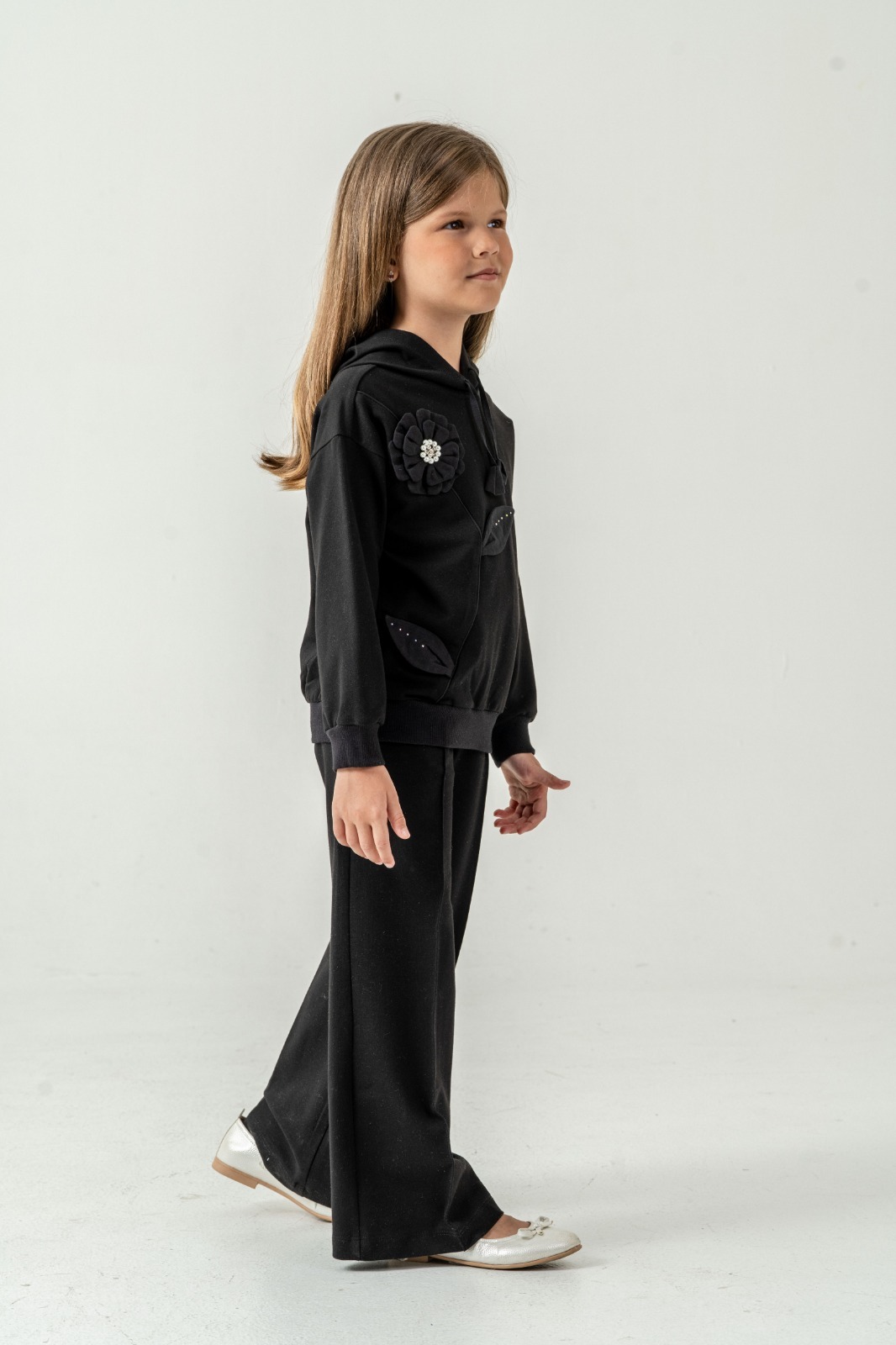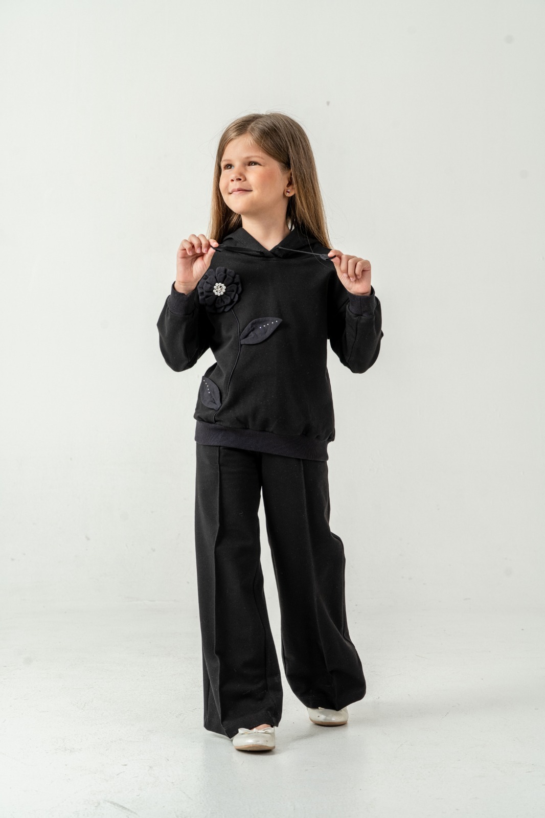 Bu kız çocuk alt üst takımı, rahat ve şık bir kış kombini arayanlar için ideal. Takımın üstü kapüşonlu ve fermuarlı olup, kordon detayları ile tamamlanmıştır. Sol tarafta yer alan büyük çiçek ve yaprak aksesuarları ürüne sevimli ve özgün bir dokunuş katıyor. Alt kısmı bol kesim uzun paça pantolondan oluşur. Takımın rengi pastel pembe tonlarında olup, yumuşak ve sıcak tutan kumaşıyla kış aylarında konfor sağlar.