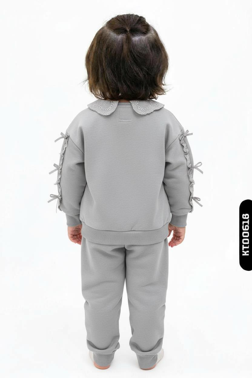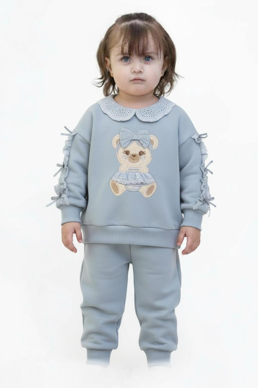 تشكيلة ملابس للبنات تجمع بين الراحة والأناقة بشكل مثالي. الجزء العلوي ذو أكمام طويلة وياقة دائرية. مزين بتطريز دب لطيف على الأمام، مع فستان القماش وربطة القوس التي تضفي لمسة جذابة. الأكمام مزينة بالدانتيل وأشرطة القوس الصغيرة على الجانبين. البنطلون ذو قصة مريحة مع أساور مضلعة حول الكاحل. التصميم بسيط ونظيف، ويوفر الدفء والراحة لموسم الشتاء.