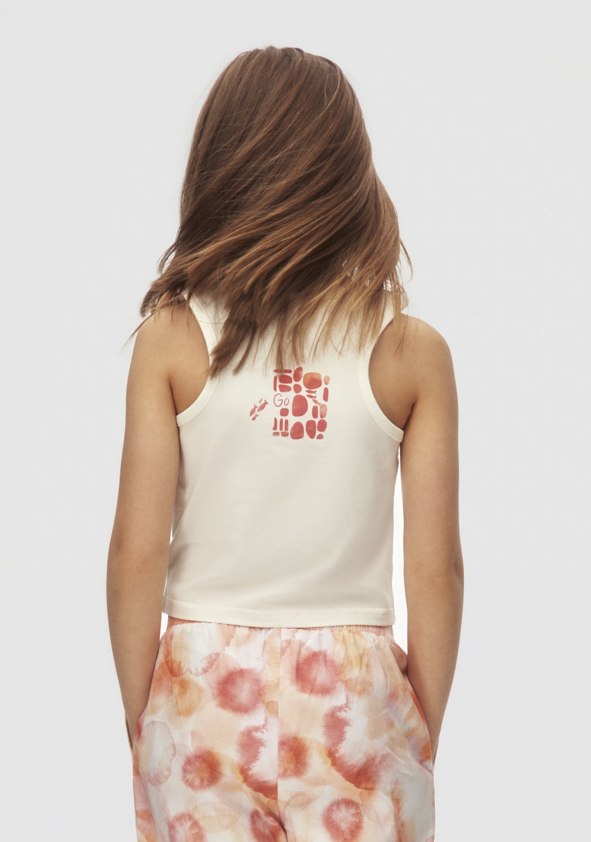 Bu kız çocuk atlet, sıcak yaz günleri için ideal hafif ve rahat bir seçenektir. Kapüşonsuz ve kolsuz yapısıyla serin tutarken, bisiklet yaka tasarımı çocukların hareket özgürlüğünü destekler. Yan kısımda küçük balık figürlerinden oluşan zarif bir baskı bulunur. Atlet, ekru tonunda ve kısa boyda olup spor ve günlük kombinlere kolayca uyum sağlar.