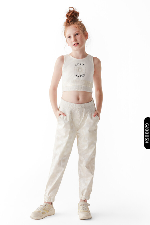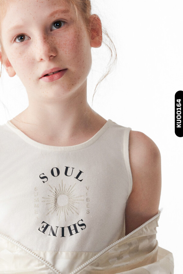 Yaz ayları için tasarlanmış bu kız çocuk atlet, rahat ve şık bir seçenek sunuyor. Kolsuz ve sıfır yakalı yapısıyla serin tutarken, ekru rengindeki sade tasarımı her kombine uyum sağlar. Ön yüzünde "Soul Shine" yazısı ve güneş motifi ile enerjik bir yaz havası yansıtıyor. Bel kısmındaki dokulu detay, atletin tasarımına zarif bir hareket katıyor. 9-14 yaş arası çocuklar için uygundur ve yaz sezonunun sıcak günlerinde ideal bir tercih olacaktır.