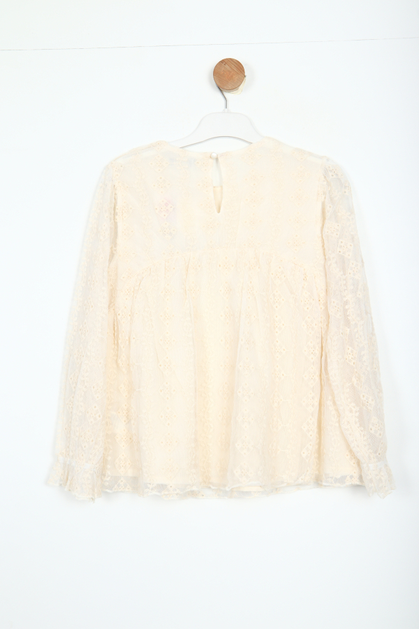 This girls' blouse is perfect for special occasions with its elegant and stylish design. Made from cream-colored lace fabric featuring delicate embroidery details. It has long sleeves with slightly ruffled cuffs and a round neckline. The blouse closes at the back with a single button, offering a comfortable yet sophisticated look.